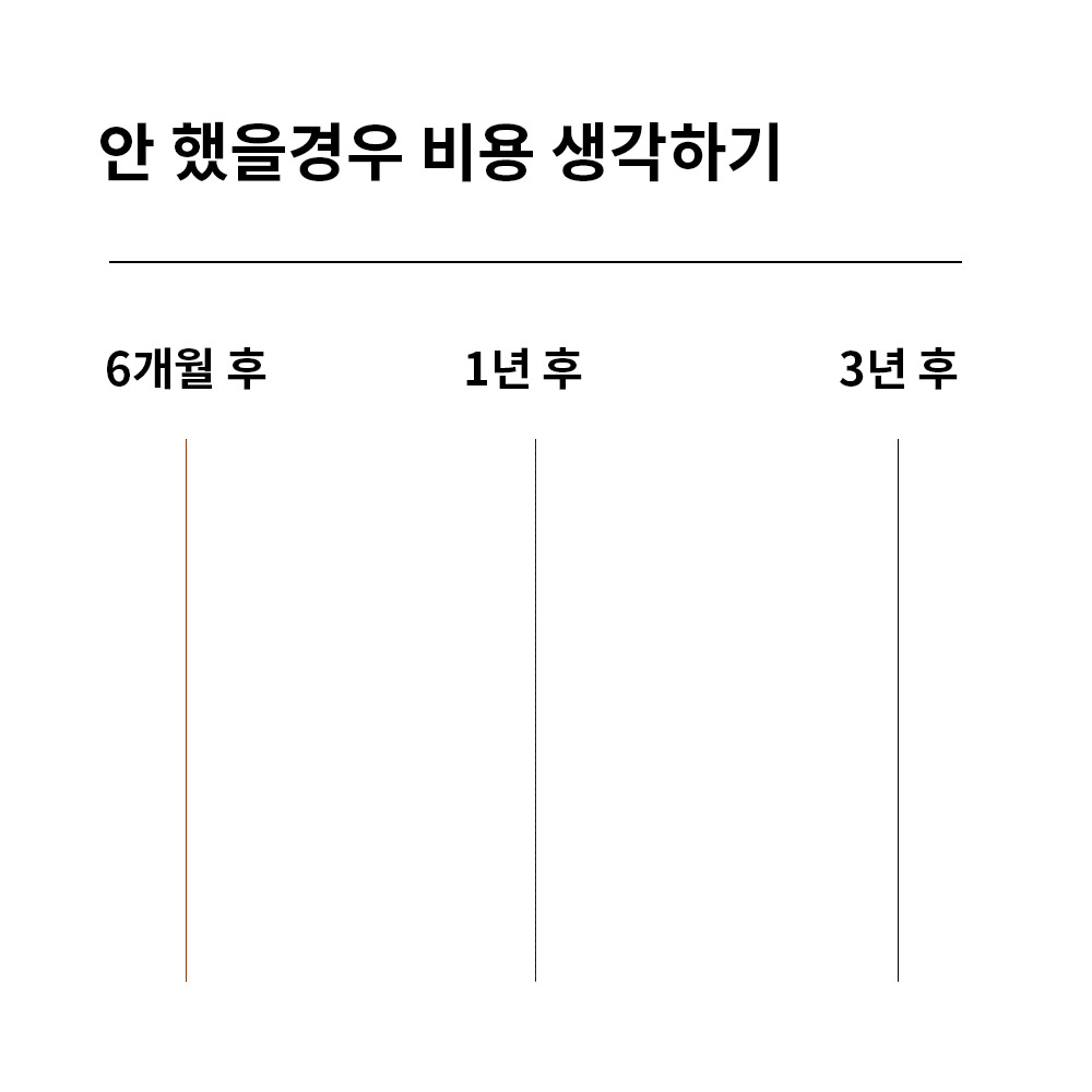 가장 중요한 부분은 세 번째, 마지막 단계입니다. ‘안 했을 경우의 비용’을 생각해 보세요. 내가 이러한 결정을 피한다면 6개월, 1년, 3년 후의 내 모습은 어떨까? 아주 자세히 생각해 보세요. 감정적이든, 금전적이든, 물리적이든, 뭐든지요!