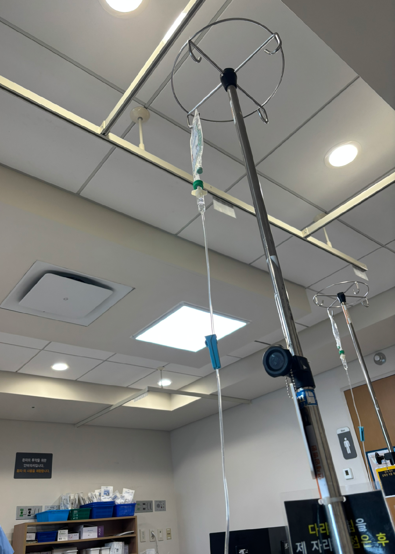 숨이 가쁘고 어지러워 비좁은 대기실 가운데 겨우 난 한자리 의자에 앉는다.