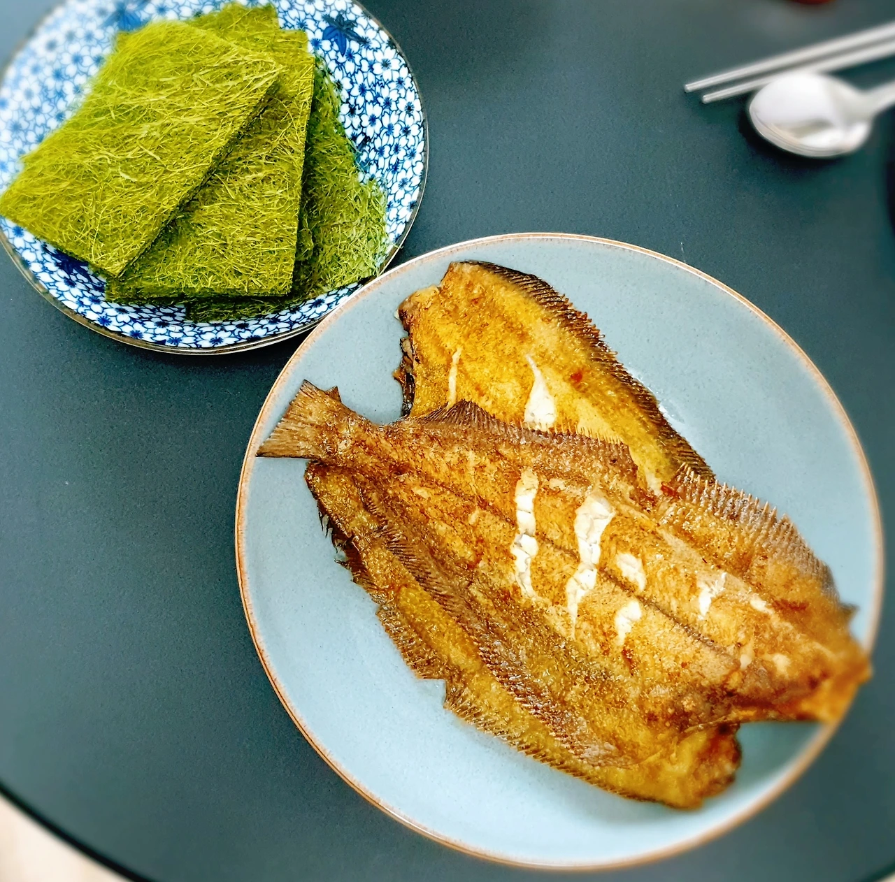 팬을 잔잔하게 달군다. 가자미 군이 주인공이니까 우리는 엑스트라. 엑스트라 버진 올리브유를 두른다. 열이 오르면 노련한 119 구급대원처럼 가자미 군을 천천히 눕힌다. 혹여 잔가시 하나라도 떨어져 나가지 않도록 조심스레 지켜보다가, 다시 몸을 뒤집어 반대쪽에도 온기를 더한다. 창백했던 피부가 노릇노릇 야무진 색을 찾는다. 잔가시에서 파삭파삭한 시장 통닭의 기운이 느껴지면 그릇에 안치한다. 마침 집에 며칠 전 사둔 감태가 있다. 따숩게 덮어줄게.