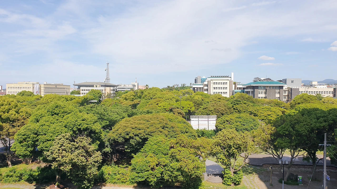 면세점 털러 왔지만 그래도 명색이 제주인데 바다는 봐야지. 연동에선 가장 빠르고 게으르게 바다를 보는 방법이 있다. 브로컬리 닮은 삼다공원 나무 틈에서 북으로 고개를 돌리면 된다. 도청에서 공항까지는 주욱 내리막길. 시야를 해칠 만한 건물도 없다. 도지사 나으리 오션뷰를 지키려 인허가를 내주지 않았나 의심이 든다.
