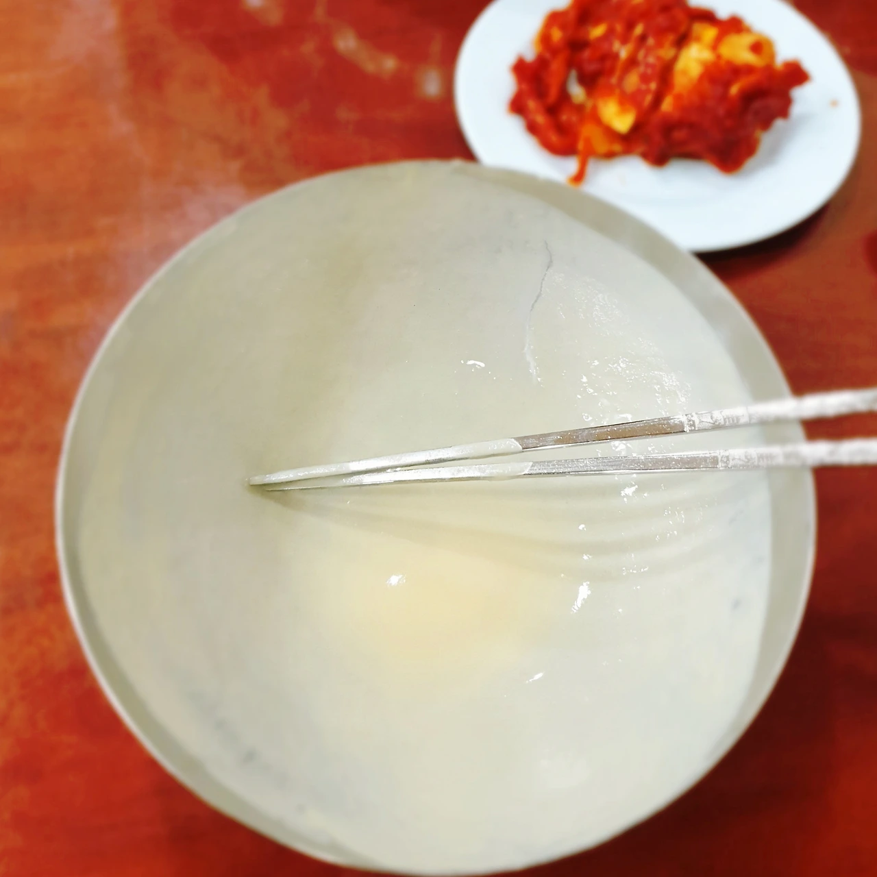 조금 과장하면 진주집에선 앉자마자 음식이 나온다. 콩국수라는 말이 끝나기도 전에 종업원은 주방을 향한다. 상에 젓가락을 깔고 스뎅 양푼에 물을 따라 목을 축이고 있자면, 내려놓는 양푼과 경쟁하듯 국수 사발이 달려온다. 세이프냐 아웃이냐. 판정에 앞서 강렬한 빨간 보쌈김치가 시선을 뺏는다. 색감만큼 제법 센 맛이다. 매콤달큰하면서 아삭한 식감은 등촌 최월선칼국수나 김포 공항칼국수의 그것을 떠올리게 한다.