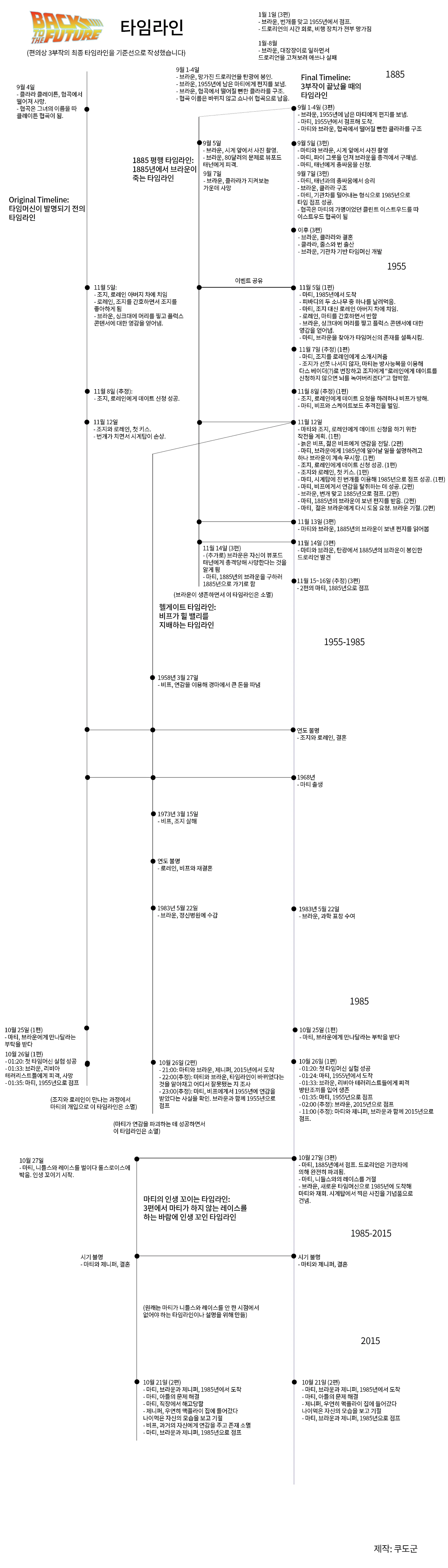 그래서 필을 받아 이 할 거 없는 주말에 3부작 타임라인을 만들었다. 포샵 실력이 미천하여 예쁘게 꾸미는 건 진작에 포기했고 최대한 각각의 평행세계와 사건이 보기 좋게 정렬되는 것에 신경을 많이 썼다. (만들고 보니까 영화 세 편으로 평행우주 다섯 개를 만들어냈다. 대단한 사람들이다)