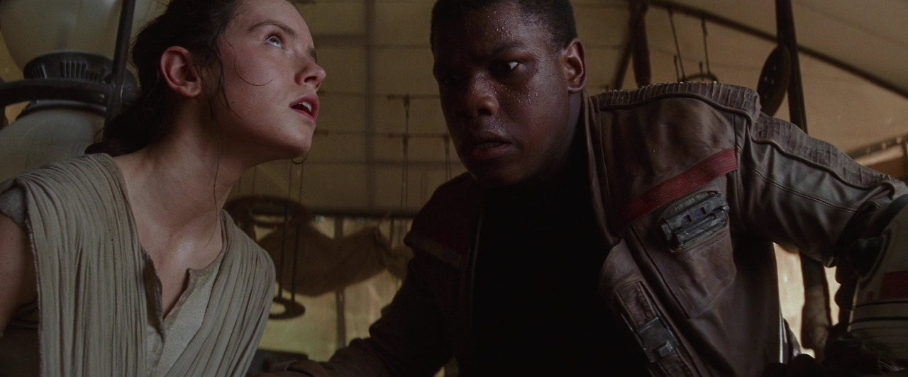 6. 핀과 레이의 첫 대면 장면 대부분은 재촬영돼야 했다. 에이브럼스가 핀과 레이의 관계를 촬영 때까지 확립시키지 못했기 때문이다. 핀이 자신이 저항군 군인이라며 거짓말하는 부분이나, 레이가 루크 스카이워커가 누군지 아는 부분, 그리고 그들 사이의 미묘한 감정 모두 재촬영으로 추가된 부분이다. 밀레니엄 팔콘에서 타이 파이터 격추에 성공하고 난 직후에 나누는 대화도 재촬영된 부분이다. 이전 버전은 훨씬 경직돼 있었다고.