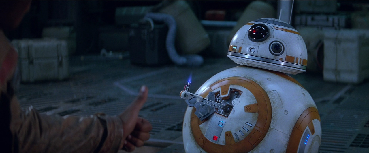 8. 픽사의 창립자인 존 라세터는 영화의 초기 편집본을 보고난 후 에이브럼스에게 BB-8이 좀 더 물리적인 코미디를 보여줬으면 한다고 말했다. 그 결과가 그 유명한 BB-8의 ‘엄지 척’ 장면이었다.