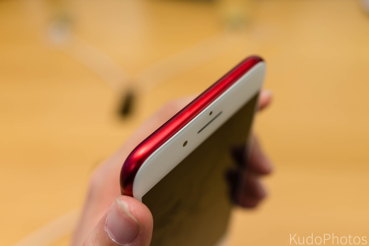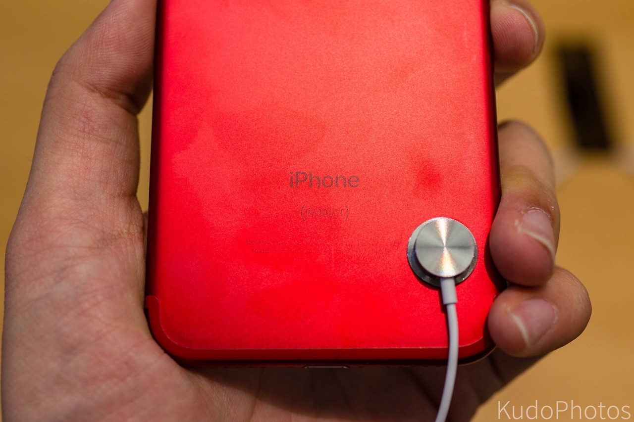 음. 빨갛다. 정말로 빨갛다. 조명에 직접 비춰보면 눈이 시릴 정도로 빨갛다. 프레스 사진으로 봤을 때도 색깔이 잘 뽑혔다는 생각이 들었는데, 직접 보니 이건 또 다르다. 사실상 아이팟 터치의 프로덕트 레드와 거의 비슷하긴 한데, 약간 더 진하고 어두운 톤이다. 물론 조명따라 다르긴 하겠지만. 애플 로고는 실버나 골드, 로즈 골드 아이폰과 비슷하게 완전히 폴리시 된 스테인리스 스틸이어서 하얀 광원에 비추면 반짝반짝 빛난다.