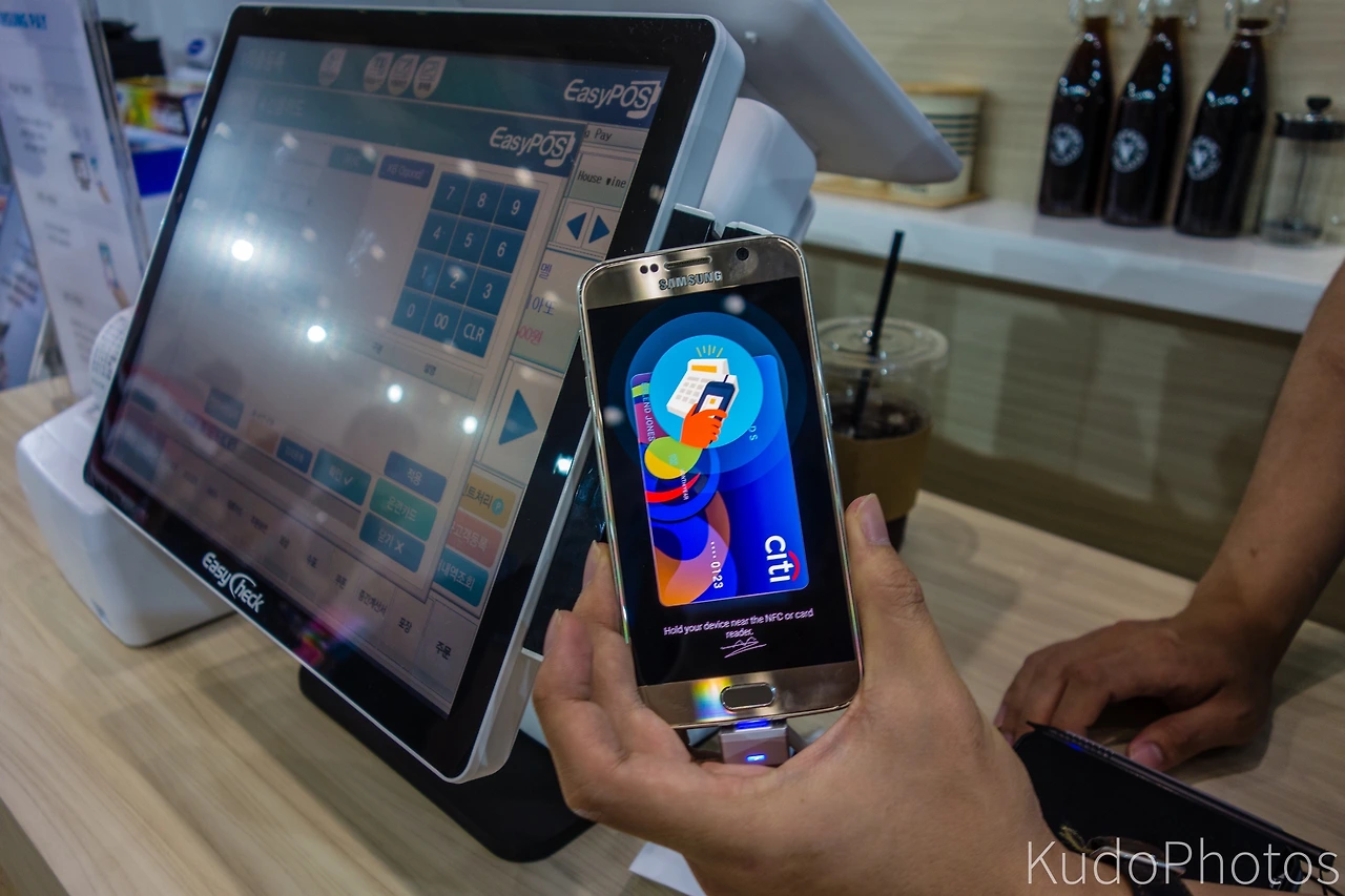 한쪽에서는 7월에 런칭한다는 삼성페이 시연을 하고 있었다. 방식은 폰을 잠근 상태에서 특정 제스쳐(오른손으로 폰을 잡은 채로 오른손 엄지로 아래서 위로 올리는 모션이었던 거 같다)로 카드 화면을 불러온 다음, 지문인식으로 카드 잠금을 해제한다. (이는 15초동안 카드만 해제된다) 그러고 폰을 점원에게 넘겨 카드결제기 근처에 대고 있으면 결제가 되는 형식이다. 삼성 측에서는 이 화면에서는 카드 잠금 해제만 되어 있고 폰 자체는 여전히 잠겨있기 때문에 점원이 폰을 보거나 그러지는 못한다고 설명했다.