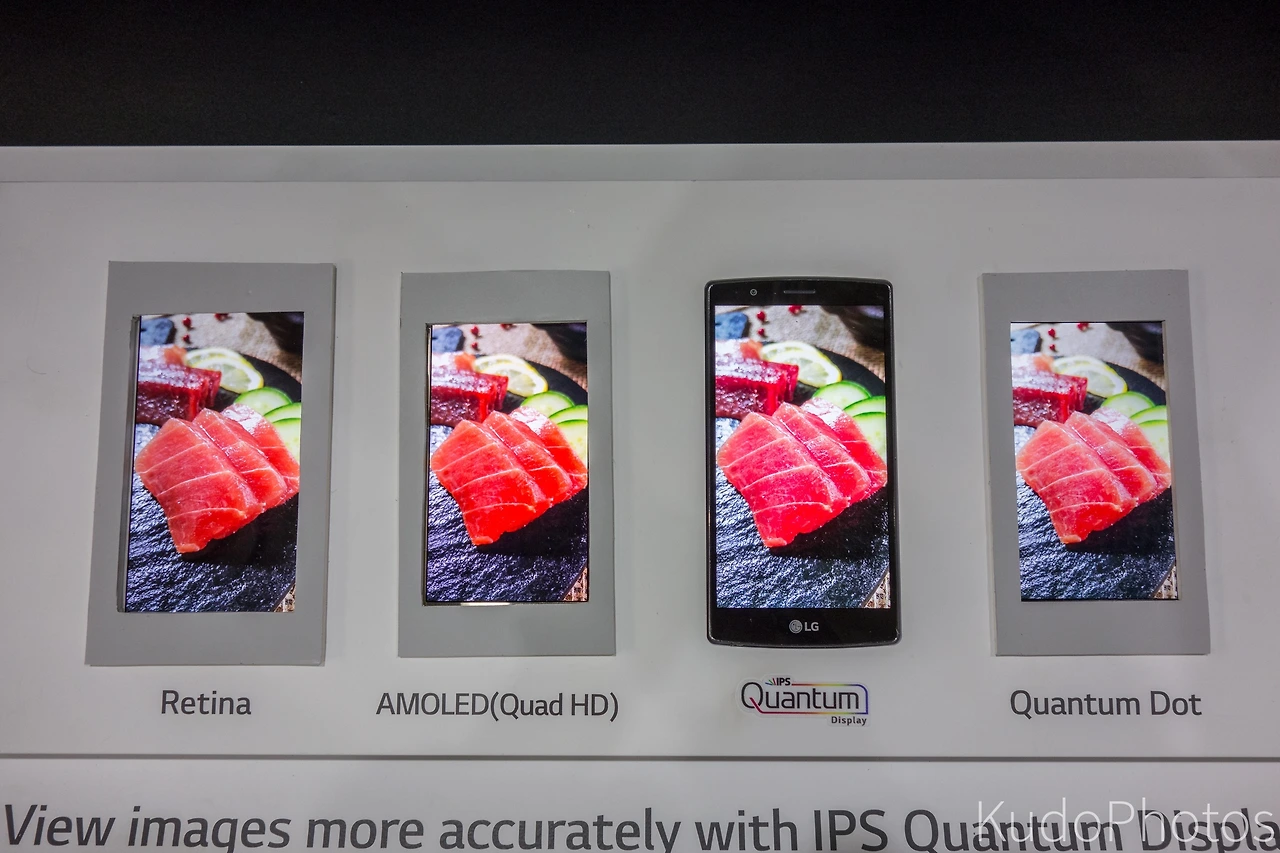 맨 오른쪽이 LG가 궁극적으로 가게 될 퀀텀 닷 디스플레이인데, 그나마 제일 색 밸런스를 잘 잡은 느낌이다. 현재 G4의 IPS 퀀텀 디스플레이는 여기서도 AMOLED보다 채도가 과하다는 걸 알 수 있다. 사실 채도는 레티나 디스플레이가 제일 낫다. (...)