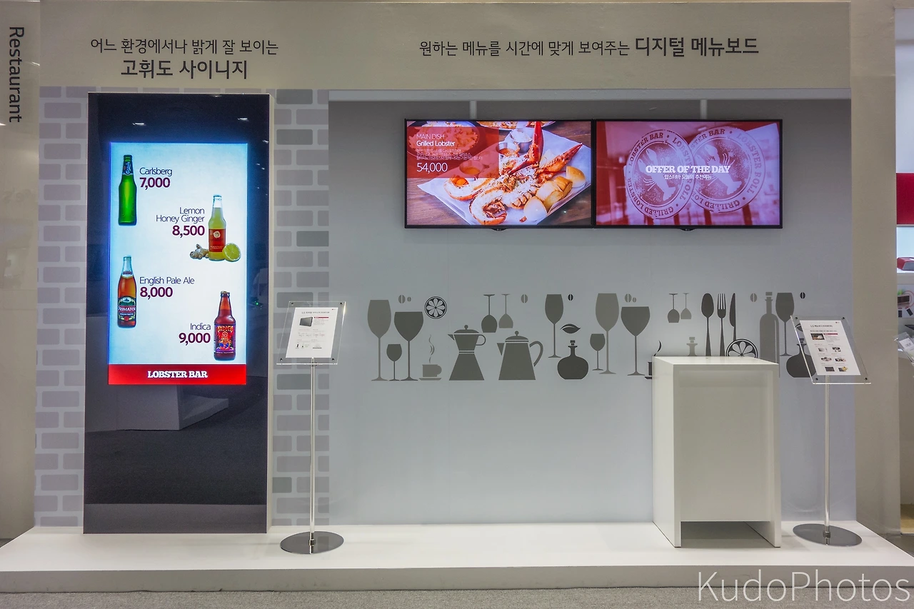 한켠에는 사업체용 디스플레이들이 전시되어 있었는데, 이 중 사이니지와 디지털 메뉴보드에 쓰인 영상은 바로 내가 (일단 방학동안) 소속된 회사인 쉬운 동영상 제작을 도와주는 쉐이커에서 제작한 것이다. 이걸 성사시킨다고 내가 입사하기 전부터 물밑작업을 많이 한 것으로 안다. 심지어 저 템플릿은 아직 공개적으로 선보이지 않은 프로토타입(?) 템플릿이다.