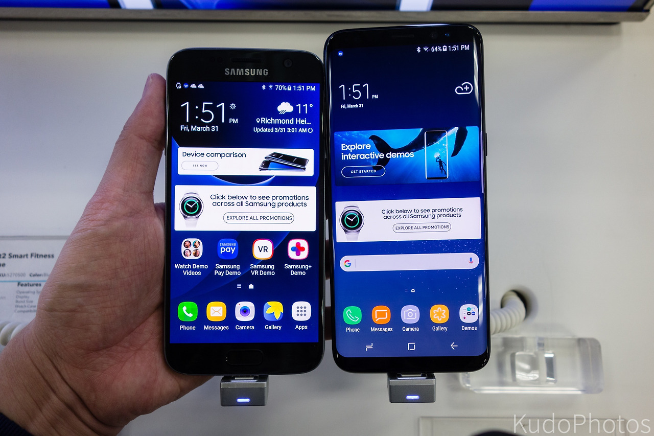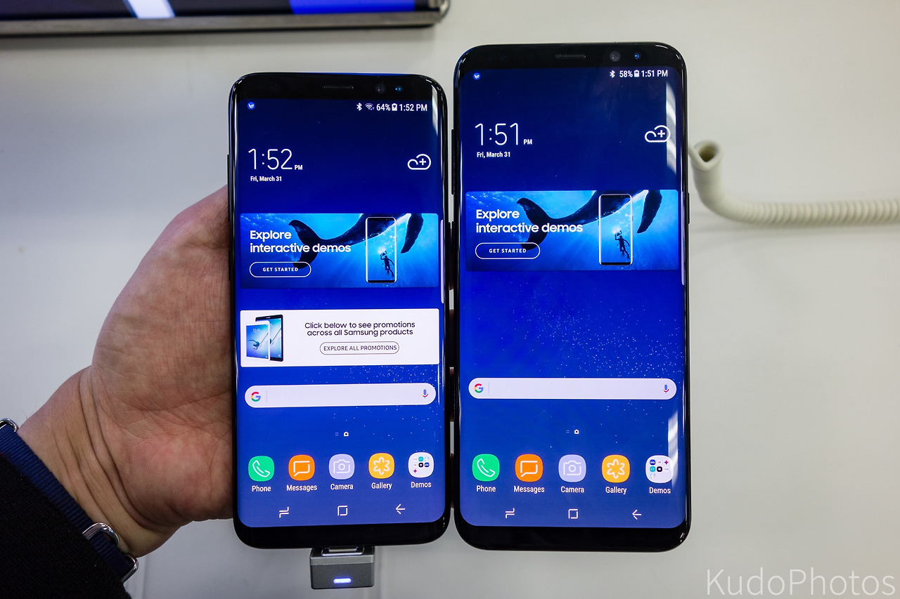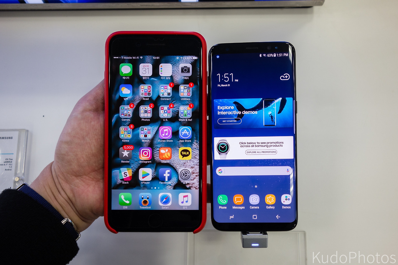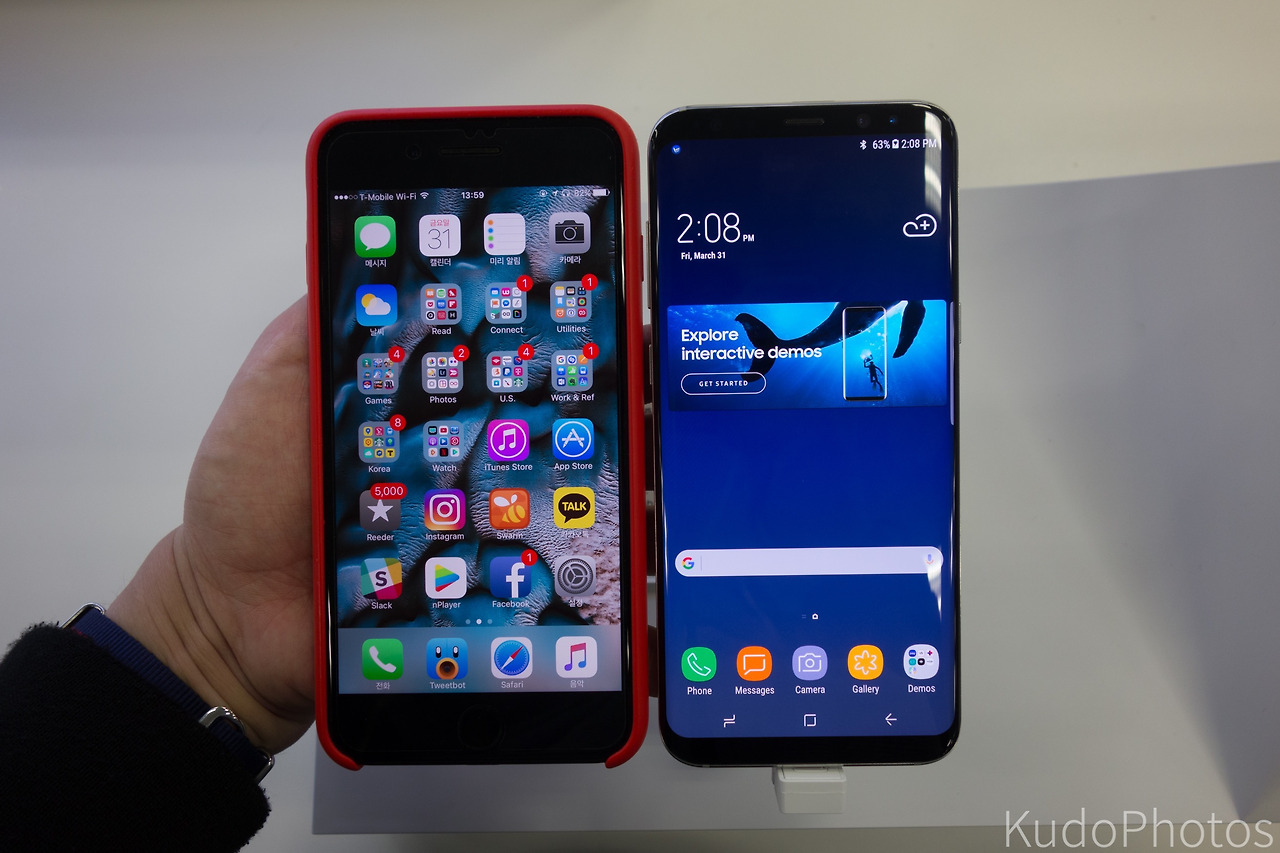 두 번째 효과는 크기이다. 5.8인치 디스플레이를 탑재한 갤럭시 S8은 5.5인치인 아이폰 7 플러스보다 눈에 띄게 작았다. 6.2인치짜리 S8 플러스가 아이폰과 크기가 거의 비슷했지만 높이만 같을 뿐, 너비는 약간 더 좁았다.
