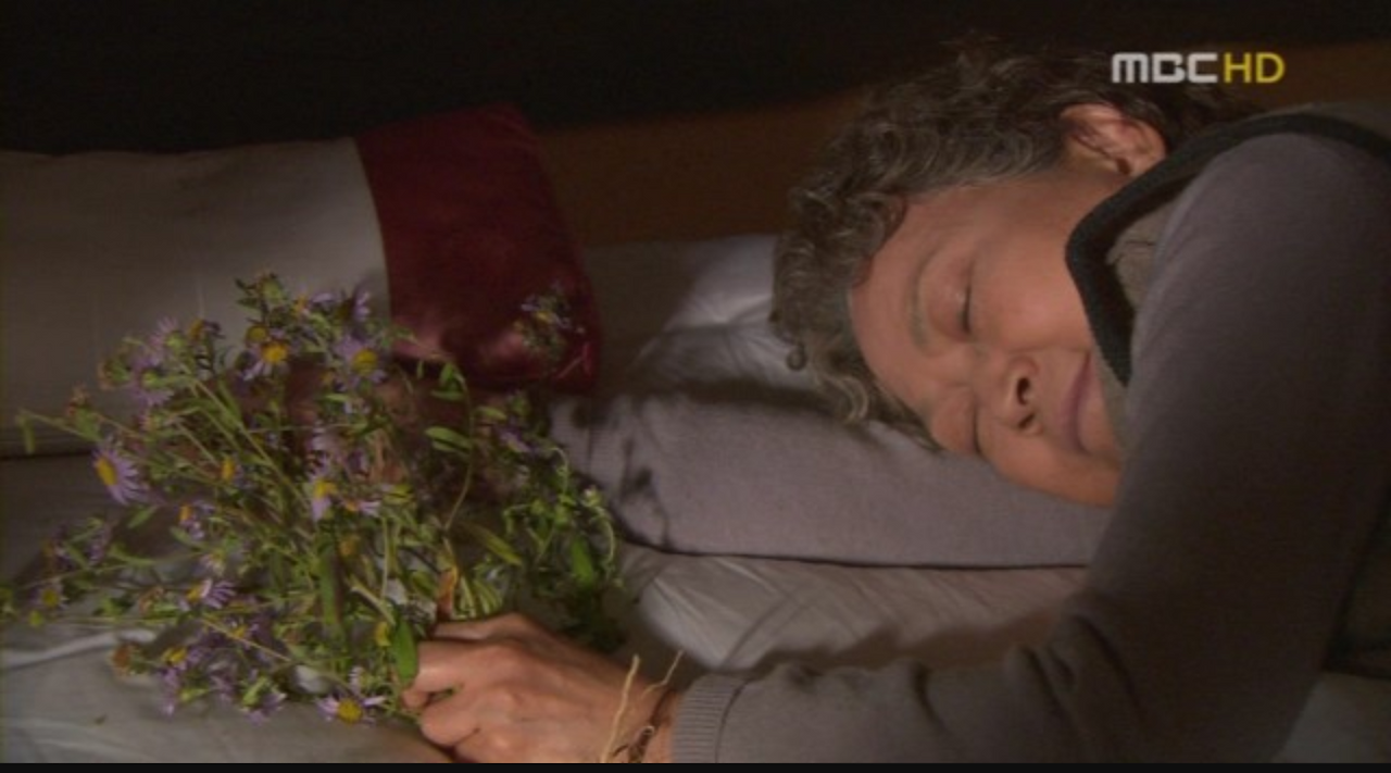 마지막 엔딩에 어머니가 쑥부쟁이를 안고 갈 곳을 잃고서, 남편의 꿈을 꾸며 누워 있던 모습이다.