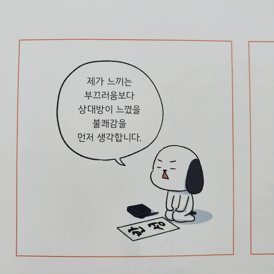 책에는 이런 질문이 있었습니다. 잘못을 지적받았을 때 부끄러움, 서운함 같은 부정적인 감정을 어떻게 떨치시나요? 저자의 답변은 다음과 같습니다. 자신이 느끼는 부끄러움보다 상대방이 느꼈을 불쾌감을 먼저 생각합니다. 아아, 오전의 상황에서 저는 경비 아저씨가 느꼈을 불쾌함보다 저의 무안하고 부끄러운 감정을 먼저 생각했습니다. 아마 경비 아저씨께서는 충분히 저의 거짓말을 짐작하셨을 것입니다. 뒷좌석의 아이를 봐서인지 크게 따지거나 질책하지 않았음에도 저는 제 부정적 감정에만 집중했습니다.
