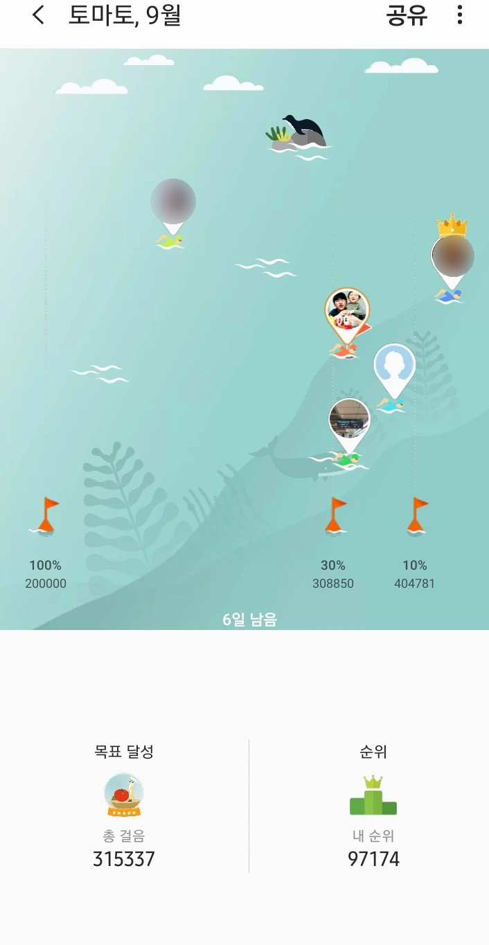 심지어 이 앱은 앱을 사용하고 있는 전 세계 사람들 중 저의 위치를 시각적으로 보여줍니다. 왕관을 쓰고 제일 앞에서 헤엄을 치고 있는 분이 1등입니다. 영어 스펠링인 것을 봐서는 외국 분이더라고요. 저는 9월 동안 315,337보를 걸었고 97,174위에 랭크되어 있습니다. 기분 좋게 상위 27프로에 속해 있네요.