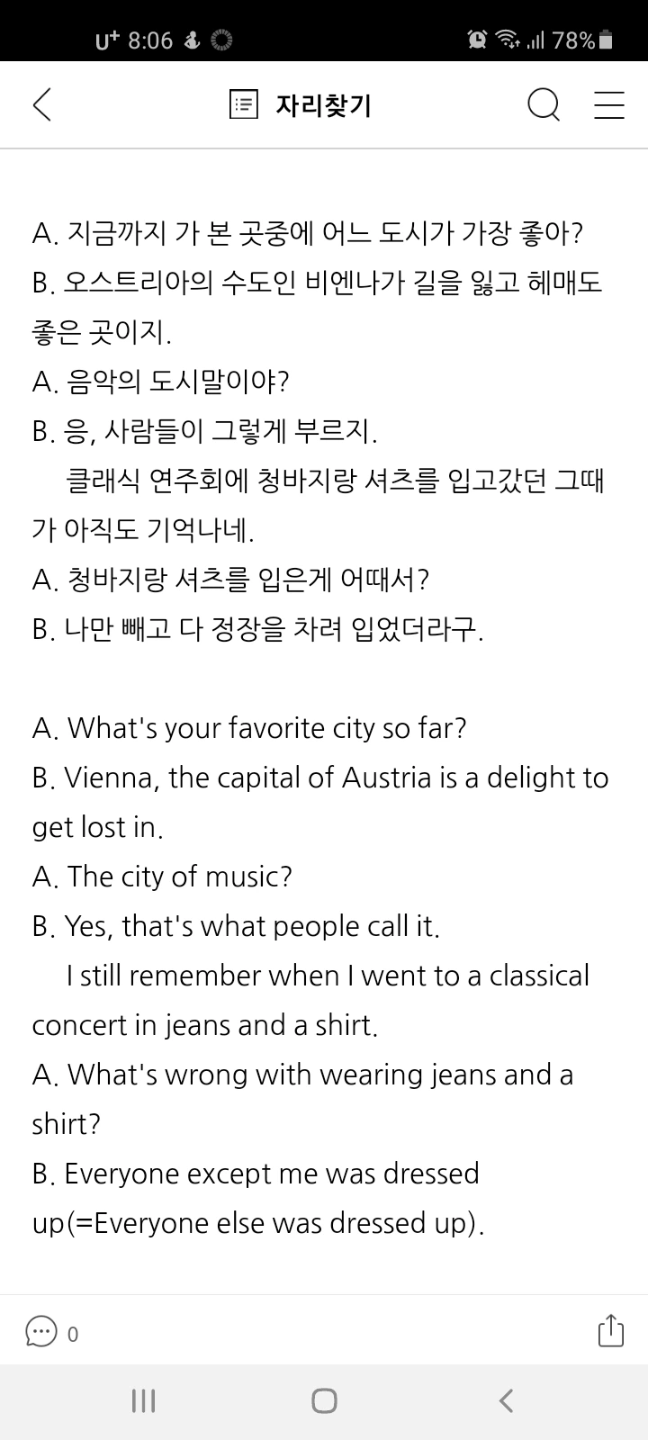 출근하기 전 와이파이가 되는 집에서 마지막으로 하는 행동이 있다. 김민식 저자의 '영어책 한 권 외워봤니'를 읽고 새로 만든 습관이다. 매일 영어 회화 공부한 내용을 블로그에 올려주시는 분이 있다. 그분의 블로그에 들어가 오늘 외울 문장들을 캡처하거나 사진을 찍어둔다. 그리고 출근길에는 혼자 캡처한 영어 문장들을 중얼거리며 직장까지 걸어간다. 특히 요즘 마스크를 착용하기에 길거리에서 혼자 영어 문장을 말하며 외워도 티가 나지 않아 좋다. 내가 현재 하고 있는 이 방식이 나의 영어 실력 향상에 얼마나 도움이 될 지에 대한 고민은 하지 않는다. 매일의 작은 노력이 언젠가는 아내의 도움 없이 혼자서 외국에 자유 여행을 나갈 수준의 회화 실력이 되기를 희망하며 오늘 하루도 한 챕터씩 꾸준하게 외운다. 출퇴근 시간을 이용해서.