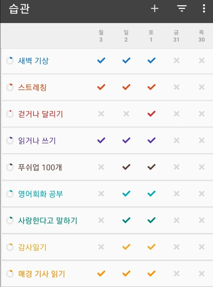 그 밖에 '스트레칭, 푸시업 100개, 영어회화 공부, 매경 기사 읽기' 등 큰 노력이 들지 않는 루틴들도 작년에 이어서 하기로 결심했습니다. 많은 시간이 소요되지 않기 때문에 어렵지 않게 매일 해낼 수 있습니다. 실제로 2년 가까이 하루도 빠짐없이 하고 있는 습관이기도 하고요.
