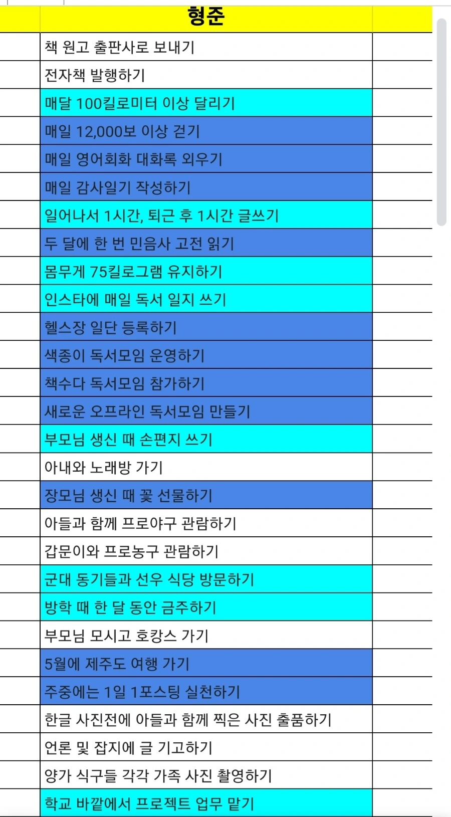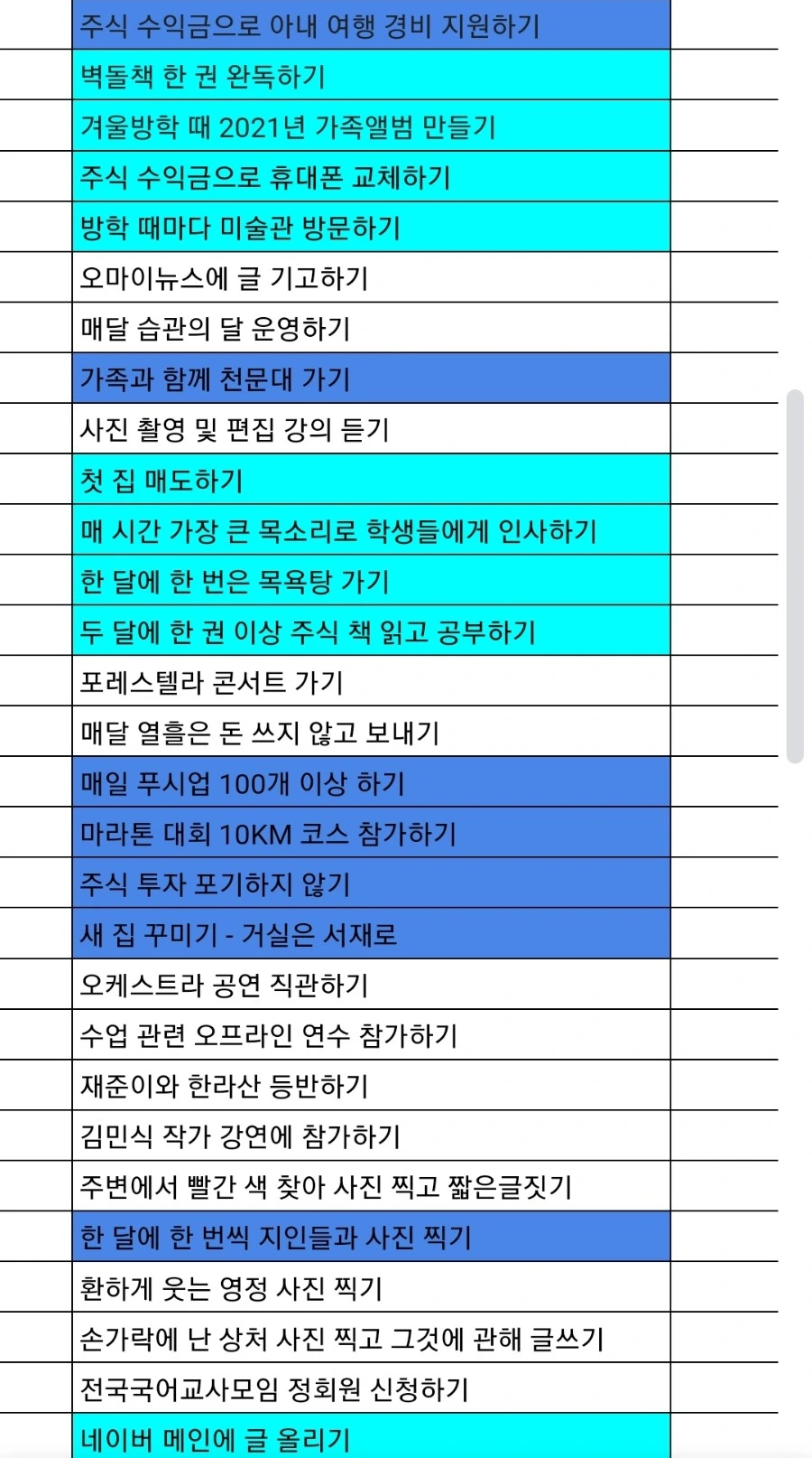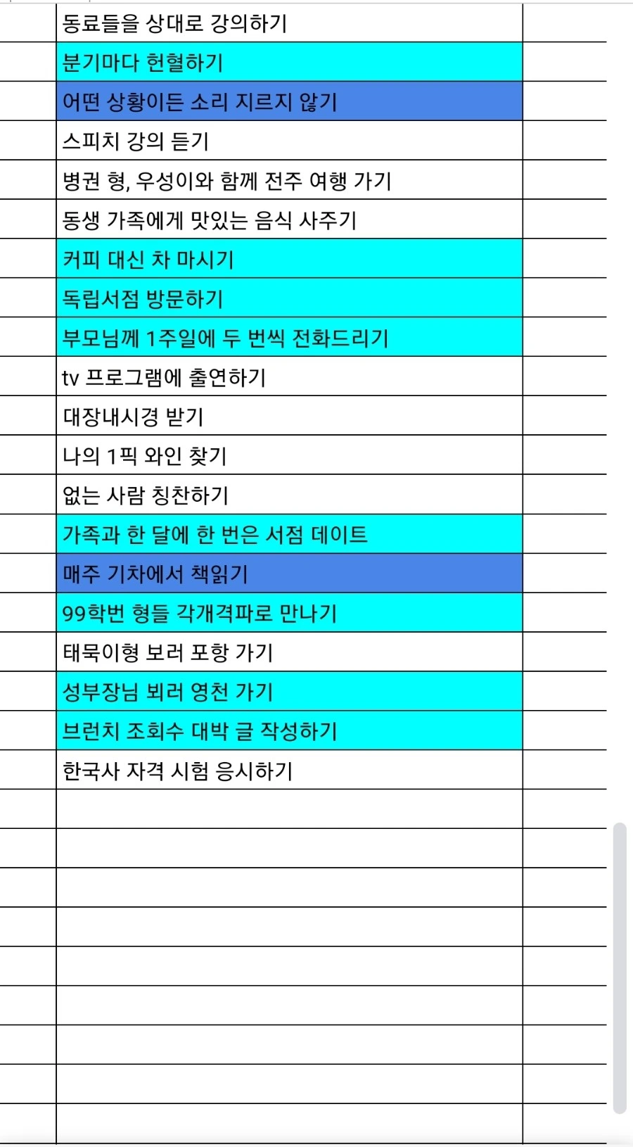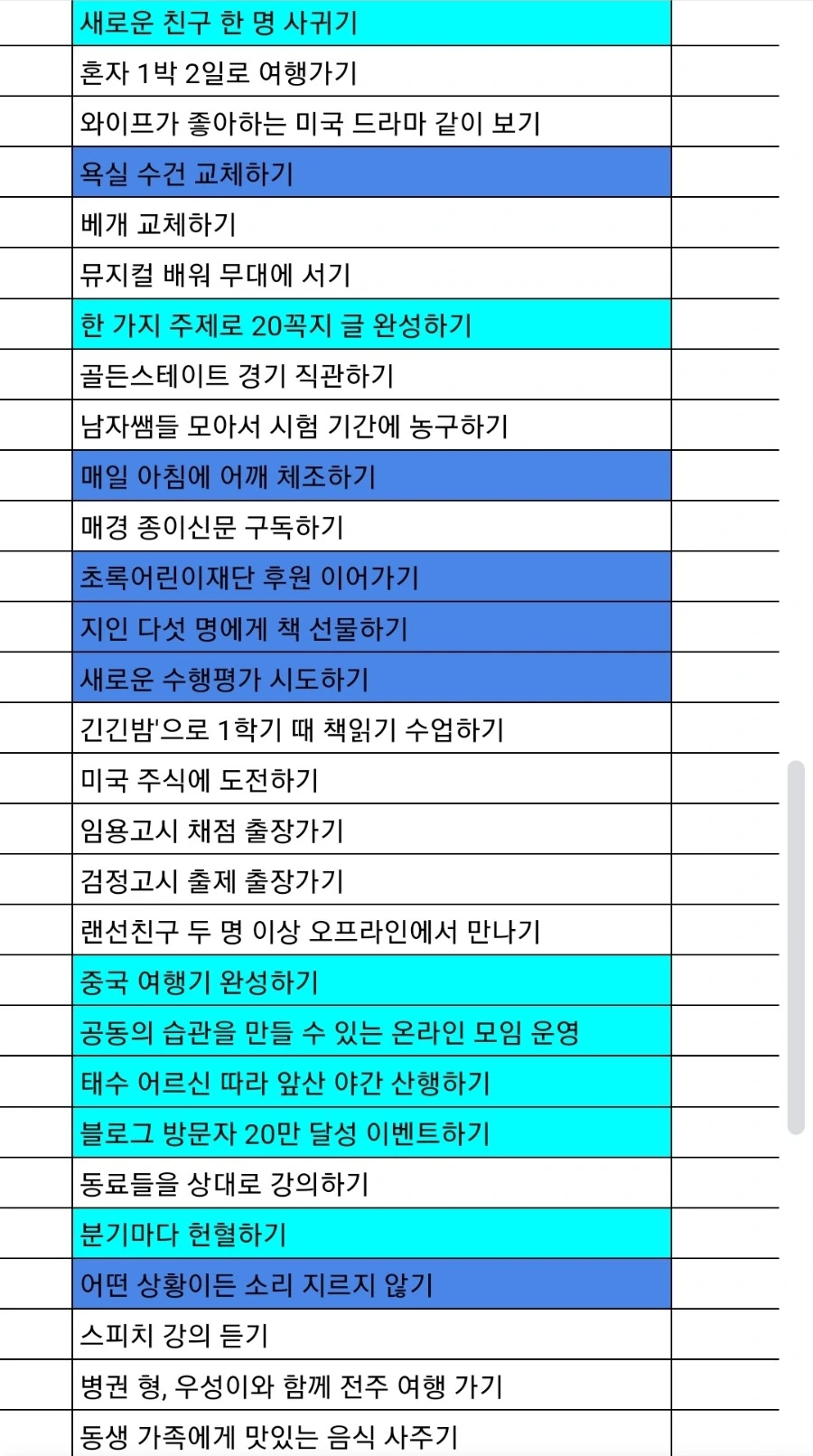 1년 전 작성했던 100개의 버킷리스트 중 몇 개나 실천했는지 체크를 해 보았다. 위의 버킷리스트는 직장 동료들을 대상으로 워크숍을 하며 함께 작성했던 것들이다. 워크숍 자료는 최호진 작가님으로부터 받아 나의 스타일로 재구성했다. 100개의 버킷리스트 중에 57개나 달성해서 꽤 놀랐다. (물론 실행 여부를 최대한 너그럽게 심사하기는 했다.) 1년 내내 버킷리스트를 잊고 지냈으면서도 꽤 많은 것을 실천한 나를 칭찬해 주었다. 특히 버킷리스트에 있는 줄 모르고 우연히 실천한 것(마라톤 대회 10킬로미터 코스 참가, 독립서점 방문하기, 지인 다섯에게 책 선물하기)을 확인할 때마다 짜릿한 쾌감이 느껴졌다. 이제 실천한 항목은 차치하고 실천하지 못한 것들을 살펴본다. '결국엔 자기 발견'이란 책에서 최호진 작가는 자신의 마음이 바뀌었다고 해서 스스로를 탓하지 말라고 했다. 내가 하고 싶은 것을 찾는 것만큼 내가 하고 싶지 않은 것들을 내 삶에서 지워가는 것 또한 버킷리스트 작성의 묘미이다. 남들이 아무리 좋다고 떠들어도 내 마음이 움직이지 않음을 확인할 수 있다면 쿨하게 그것과 작별을 고하고 시행착오를 줄일 수 있다. 실패한 항목들을 장기적으로 계획을 세워 실현해야 하는 것과 알고 보니 내가 그리 좋아하지 않았던 것, 나의 능력과 노력으로 실천하기 힘든 것 등으로 구분해 본다. (이것 역시 나만이 알아볼 수 있는 색으로 구분해 보았다.)