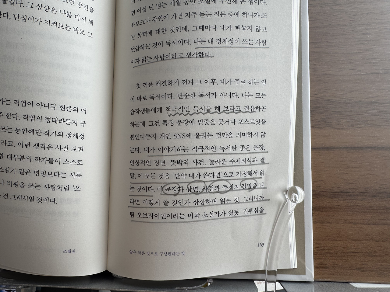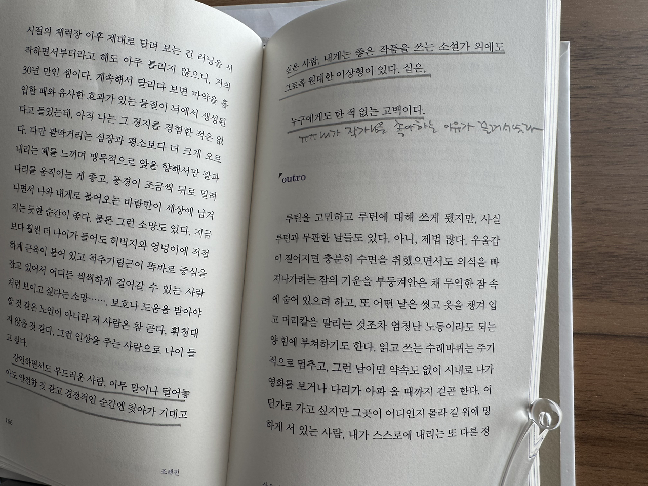 ‘강인하면서도 부드러운 사람, 아무 말이나 털어놓아도 안전할 것 같고 결정적인 순간에 찾아 기대고 싶은 사람, 내게는 좋은 작품을 쓰는 소설가 외에도 그토록 원대한 이상형이 있다. 실은, 누구에게도 한 적 없는 고백이다.’(p.167)