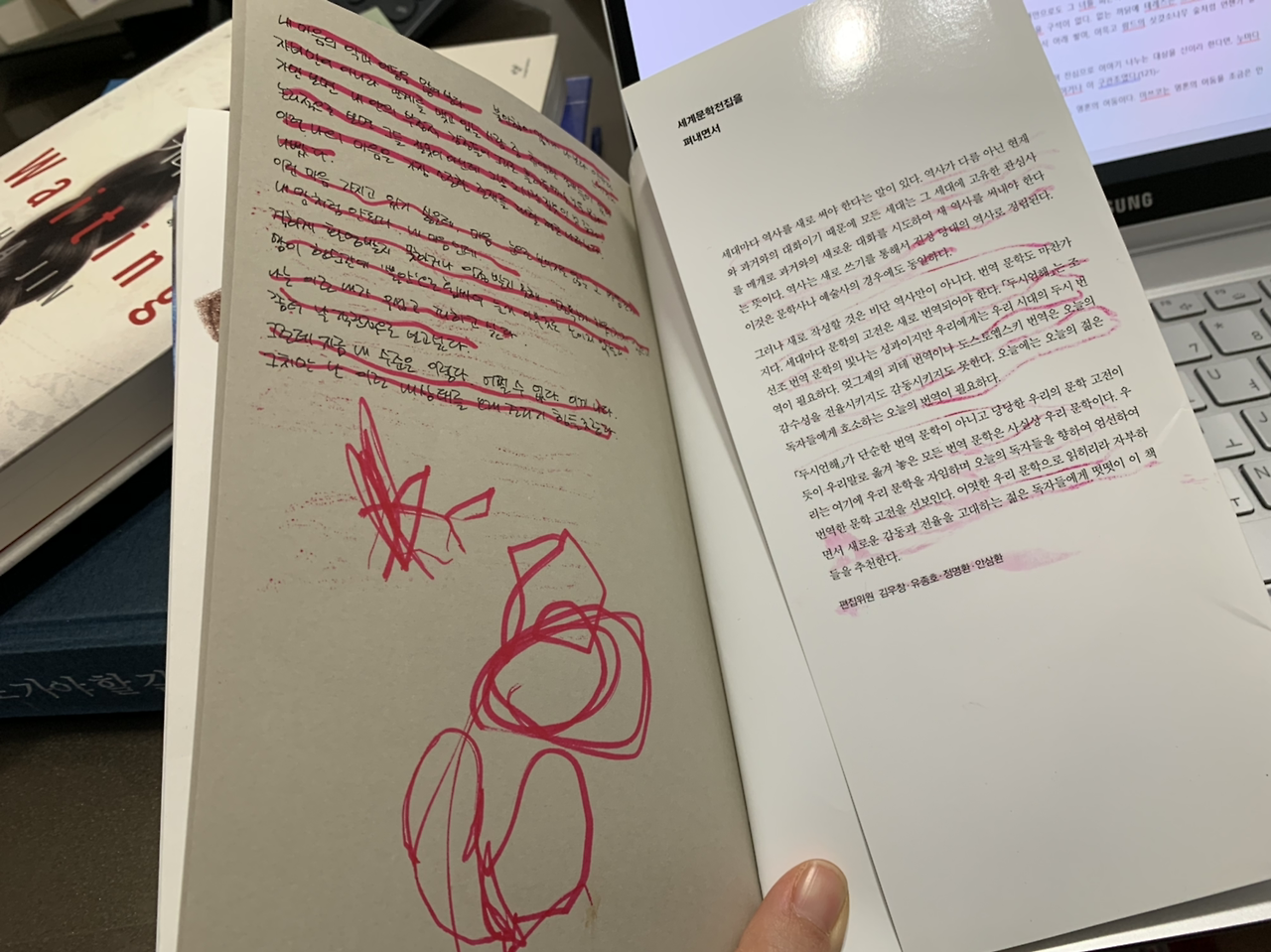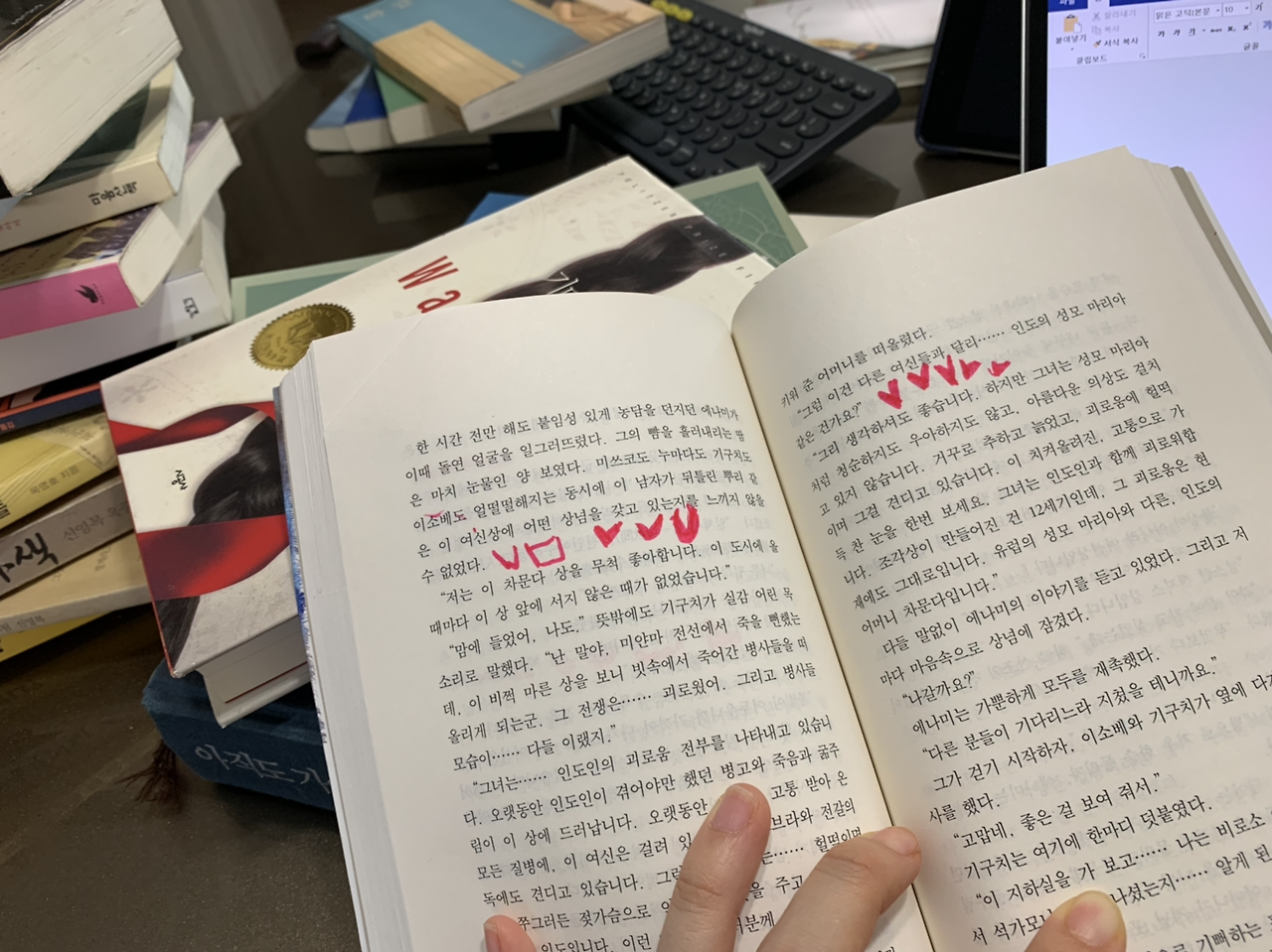 평범하게 사실을 나열한 이 문장 하나로 여러 생각에 잠긴다. 11시부터 2시, 밤과 새벽의 사이가 주는 고요함과 적막함. 피곤한 몸으로 타이핑하는 모습, 쉴 새 없이 움직이는 손목, 써내려 갈 수밖에 없는, 쓰지 않으면 터져버릴지도 모르는 그 작가의 마음이 이 새벽 그를 노트북 앞으로 이끌었으리라. 무엇이 작가를 쓰게 했을까. 쓰지 않고는 잠자지 못하게 했을까 생각했다.