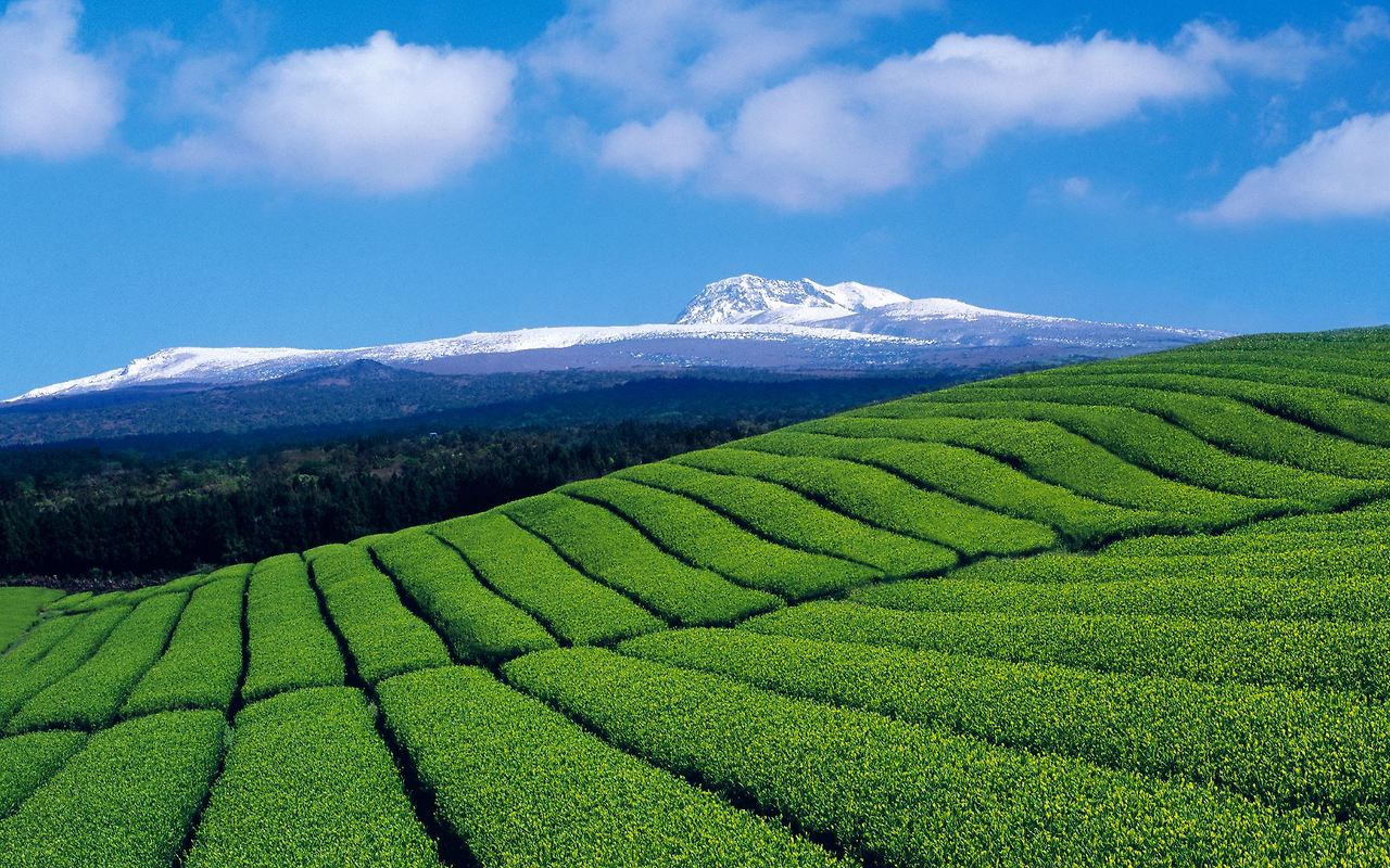 도순다원의 상징과도 같은 눈 덮인 백록담과 잘 정리된 다원(출처 : 제주 관광공사 홈페이지)