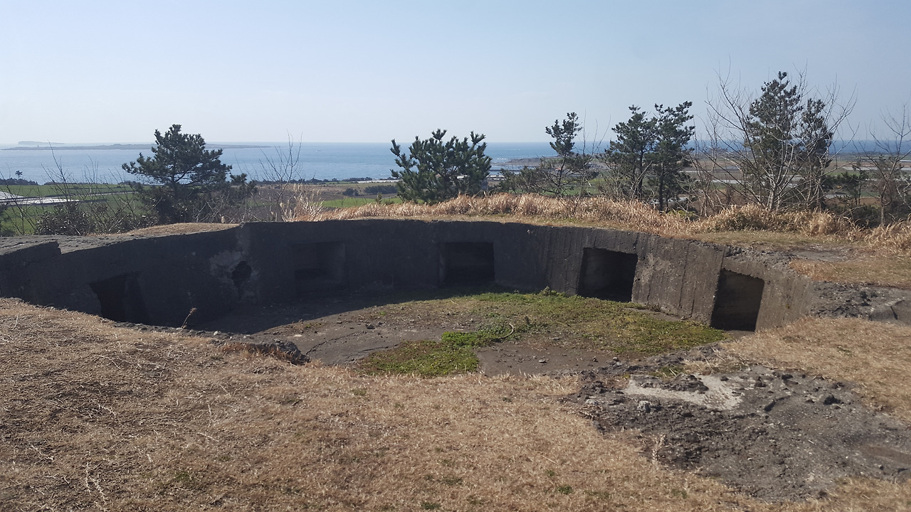 (좌) 저멀리 가파도와 마라도가 보이는 오름 정상에 있는 고사포진지 (우) 그 절벽아래 위치한 갱도진지