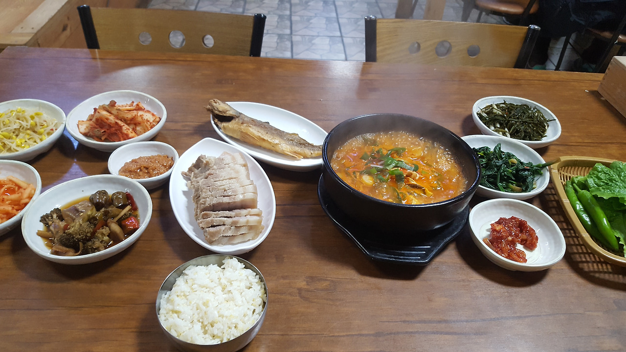 메뉴판에도 없는 저녁 정식 메뉴가 1인분에 만원인데 말도 안 되게 푸짐한 반찬에 수육에 생선까지 나왔다. 김치찌개도 한 뚝배기 나오는데 찌개만 1인분에 만원 받고 팔아도 될 정도의 큼직한 고기가 한가득 들어가 있었다. 심지어 수육을 반쯤 먹으니까 사장님이 오셔서 고기를 더 썰어드리냐고 물어보기까지 하셨고, 더 이상 아무것도 먹을 수 없을 정도로 배부르게 먹고 식당을 나갈 때는 바구니 가득 쌓여있는 귤을 “많이” 가져가라고 하시는 게 아닌가(물론 겨울에 제주에는 귤이 워낙 많아서 제주 사람들은 귤을 돈 주고 사 먹지 않고 종종 이런 식당이 있다는 풍문을 살짝 들어본 것 같긴 하지만 미담을 위해 넘어가자) 사장님이 원래 엄청난 재력을 가지고 있고, 식당은 부업이자 취미생활로 하고 있다는 느낌이 들 정도로 여유와 인정이 넘쳐흘렀다. 많이 주신 반찬이 아까워서 언젠가는 사람들 여러 명 데리고 와서 한 번은 정말 푸짐하게 싹싹 긁어먹어야겠다는 생각조차 들었다.(두 달 뒤 가족여행에서 정말 부모님을 모시고 재방문한다)