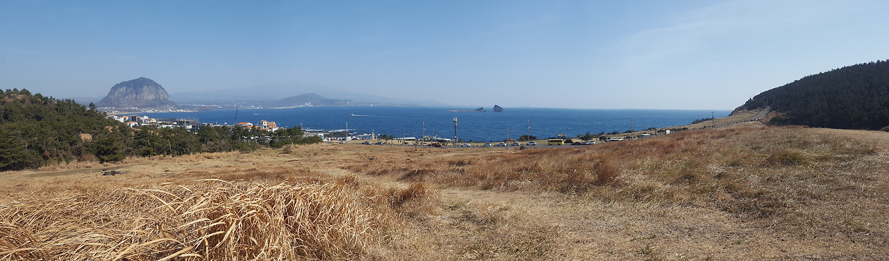 이 절경이 사진으로는 완벽히 표현되지 않아 아쉬울 뿐이다.(좌측부터 산방산, 용머리해안, 그 뒤로 희미하게 보이는 한라산, 바다 위의 형제섬, 우측의 송악산)