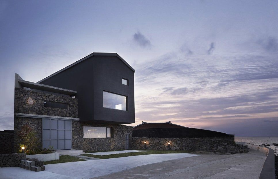 1층의 돌담 위에 먹색 건물이 얹혀 있는 듯한 외관이 인상 깊어요. 슬로보트는 동네의 풍경, 하귀리 바다의 검은 현무암과 조화를 이루면서도 묵직한 존재감을 드러내는데요.