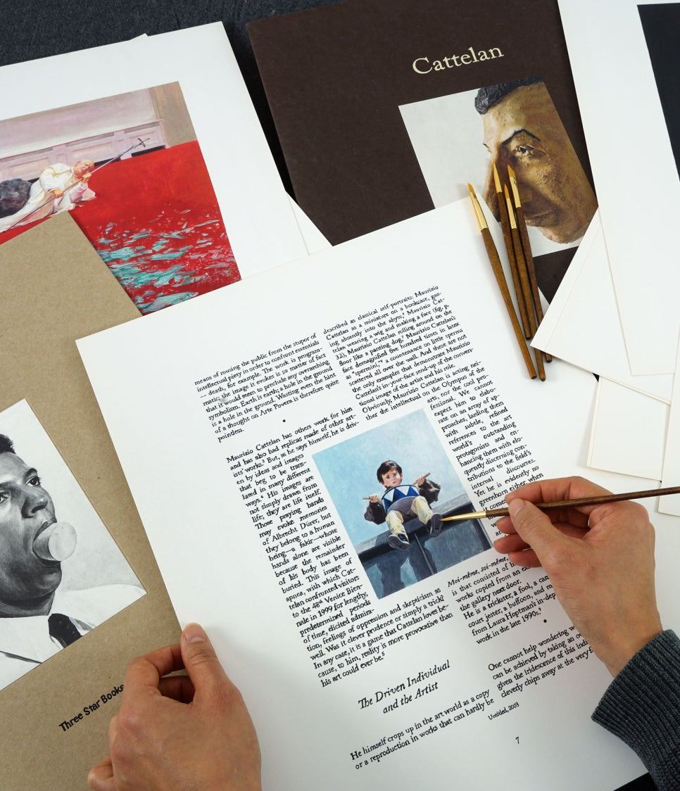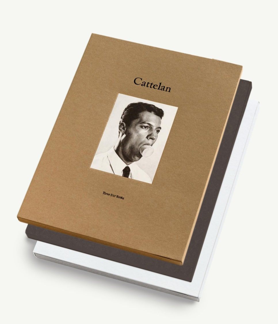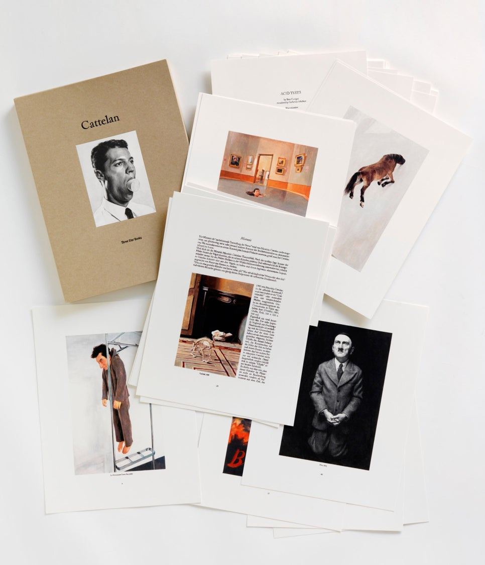 이번에 출품되는 <Three-Volume Set>은 자전적인 내용을 담고 있는 <Die/ Die more/ Die Better/ Die Again>(2008), <The Three Qattelan>(2010), <The Taste of Others>(2011) 등 3권을 엮은 책이다. 각각의 책에는 카텔란이 해왔던 다양한 프로젝트들이 사진이 아닌 그림(회화)으로 들어가 있으며, 글씨들 역시 타이핑이 아닌 손 글씨로 작성되었고, 책도 제본되어 있는 방식이 아니라 한 장 한 장 분리되는 방식이어서 작품과 책의 경계를 흐린다. 이 아티스트 북에는 광주비엔날레 총감독을 맡았던 마시밀리아노 지오니Massimiliano Gioni를 비롯해 다양한 전문가들이 참여했다. 다들 세계 최고의 위치에서 미술계를 좌지우지하는 사람들로 각각의 독립성이 카텔란의 기획하에 참여해 통일성을 갖는다.