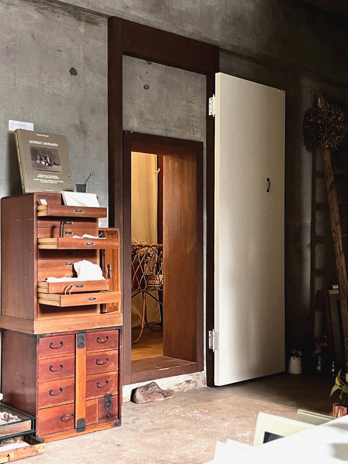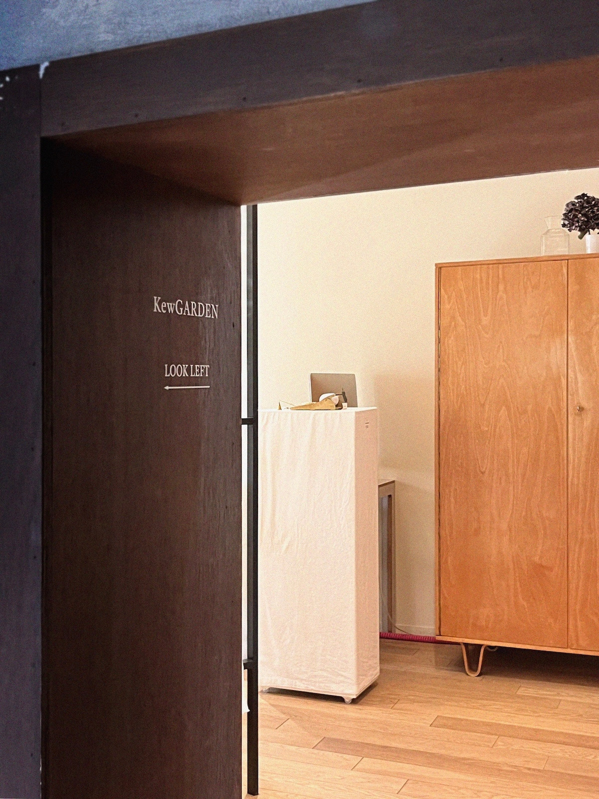 큐는 107호와 108호 사이 벽에 낸 작은 문을 통과해야 쇼룸 안으로 들어갈 수 있습니다. 앞서 말씀드린 것처럼 쇼룸으로 쓰는 108호는 원래 창고였어요. 대림맨숀은 하나의 호실이 8~10평 남짓인데, 수납공간이 없는 오래된 맨숀이라 두 개의 호실을 같이 쓰고 있었죠. 창고의 물건들을 108호에서 107호로 빠르게 옮기기 위해 벽에 문을 낸 거예요. 처음부터 상점 출입구로 만든 문이 아니라 클 필요도 없었어요.