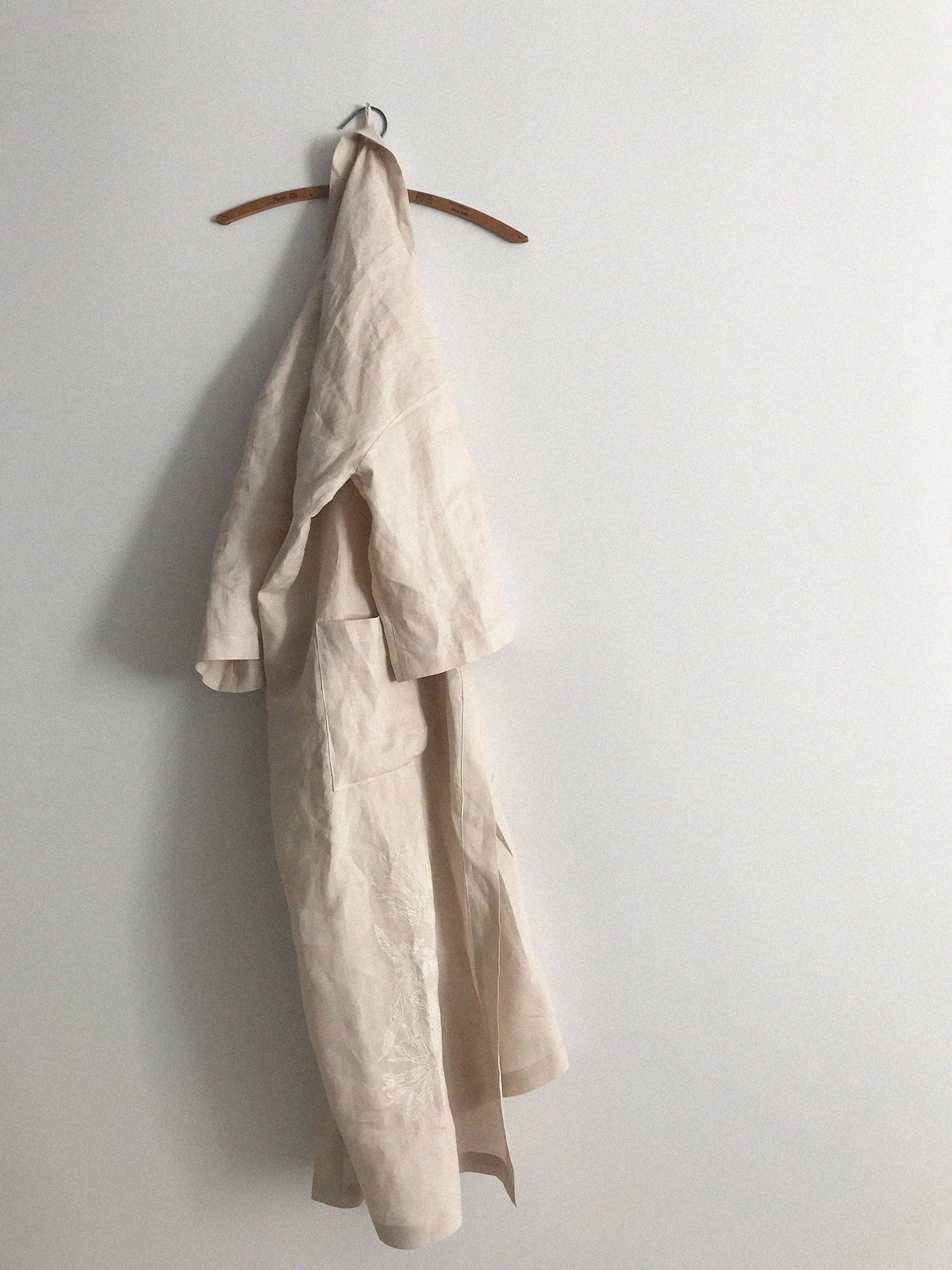 마지막으로 ‘Garden robe’라는 제품으로 가볍게 감싸 주는 기분이 좋은 로브가 있어요. 바다에 갈 때나 여름철에 유용하게 사용할 수 있죠. 주문이 들어오면 실크스크린으로 마른 꽃 드로잉과 큐 로고를 프린트해 보내드려요.