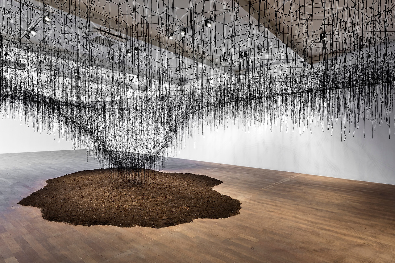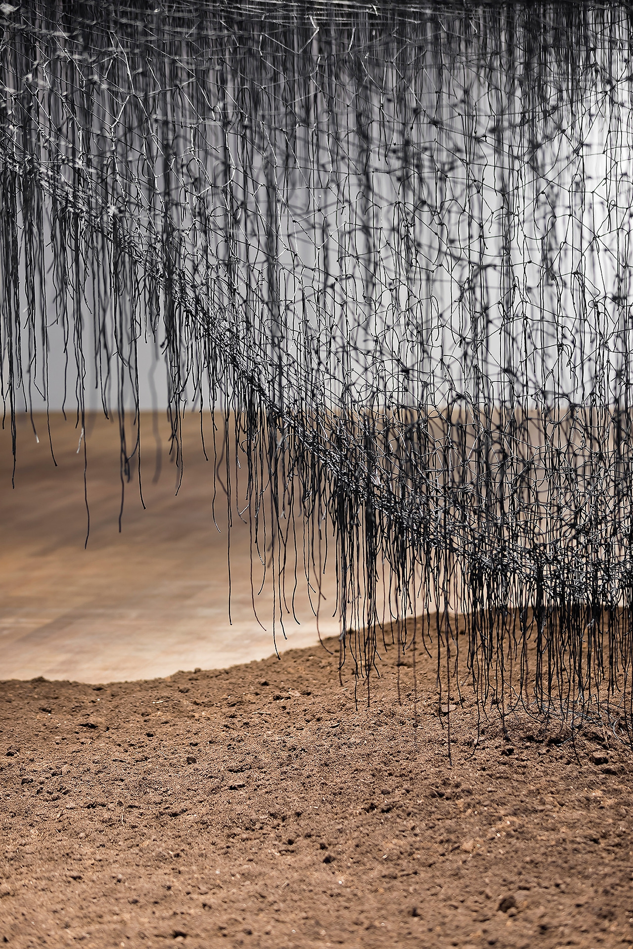 《Return to Earth》는 이러한 맥락을 잇되, 인간 실존을 더 근원적인 차원으로 끌어올린다. 이번 전시의 핵심은 생명이 흙으로부터 비롯되어 결국 다시 그곳으로 돌아간다는 믿음이다. 전시장 한가운데 자리한 전시 제목과 동명의 대형 설치작 <Return to Earth>(2025)은 천장에서 바닥까지 얽힌 검은 실이 흙더미와 맞닿으며 장엄한 풍경을 만들어낸다. 시오타는 “우리는 세상을 만들었다고 생각하지만, 단지 그 일부일 뿐”이라고 적었다. 작품 앞에 선 관람객은 자신이 거대한 순환 질서 속에서 아주 작은 한 조각일 뿐임을 직관적으로 체감한다. 죽음을 단절이 아니라 자연의 질서 안에서 귀환하는 것이라는 사고의 전환이 이 전시에 담겨 있다.