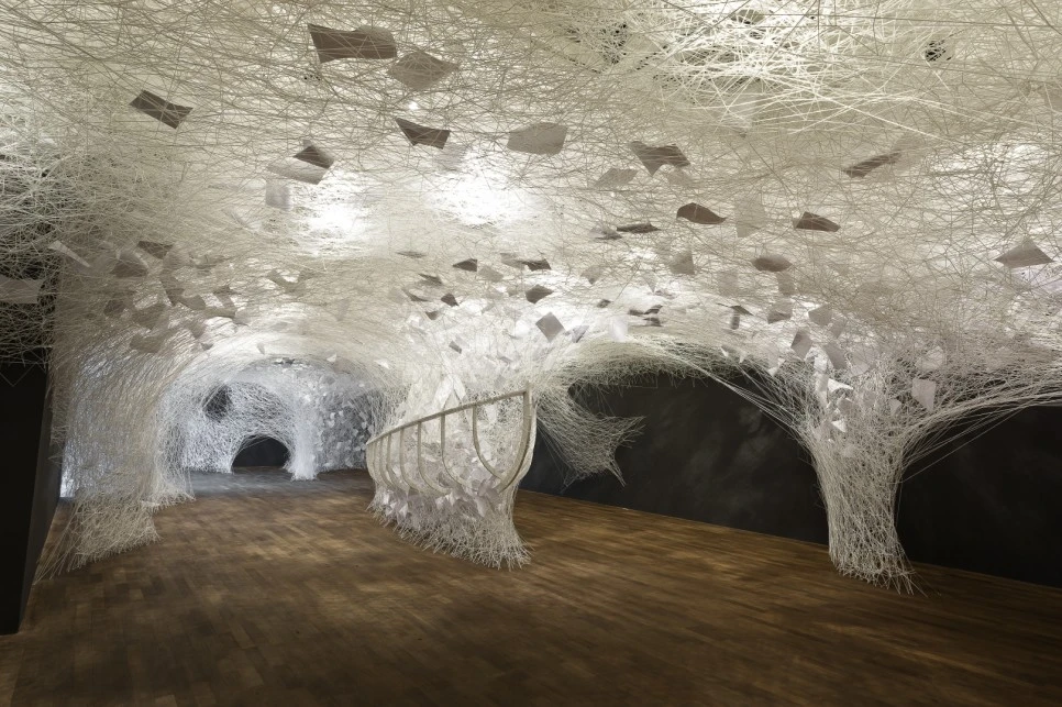 이후 2022년에 열린 《In Memory》에서 작가의 관심은 한층 더 깊은 내면적 차원으로 이동한다. 붉은 실 대신 흰 실이 전시장 전체를 채우고 그 안에는 배와 드레스 같은 사물들이 걸려 있었다. 이는 사라진 존재와 과거의 시간을 불러내는 매개체였다. 시오타는 “물건에는 기억이 붙어 있다. 사물은 우리보다 오래 살아남아 이야기를 계속 이어 간다”고 적으며 기억을 단순히 개인의 뇌리에 머무는 것이 아니라 사물과 공간 속에 잔존하는 에너지로 해석했다. 관람객은 실 사이를 통과하며 사물이 품은 기억을 불현듯 마주하고 잊힌 듯한 과거와 현재의 시간이 중첩되는 경험을 한다. 《Between Us》가 현재의 관계를 통해 ‘나’를 인식하게 했다면, 《In Memory》는 과거의 기억을 소환하며 존재의 연속성을 되묻는 전시였다.