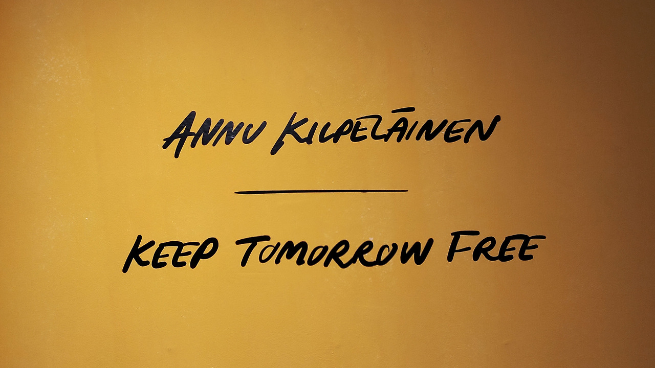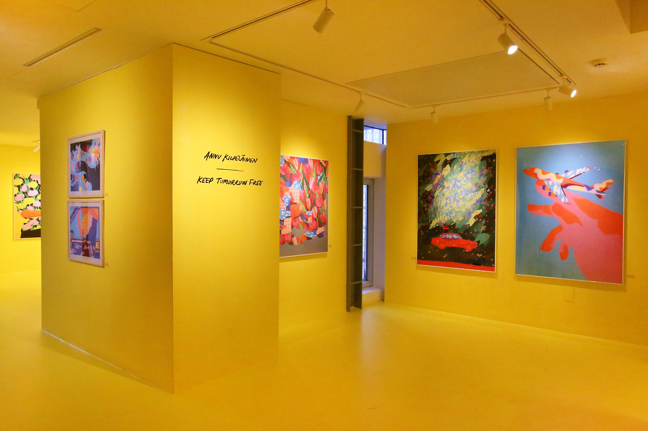 아누 킬팰레넨은 ‘Keep tomorrow free’ 문구의 의미를 자신만의 색채로 표현한다. 개인의 삶 속 순간 순간을 변화 무쌍한 색상과 패턴, 형태로 그려냄으로써 어지러운 바깥 세상이 아닌 지금을 살아가는 나 자신에게 집중하는 것이다. 전시 공간 역시 그의 작품에 비치는 햇살처럼 노란색으로 가득 채워져 있다.
