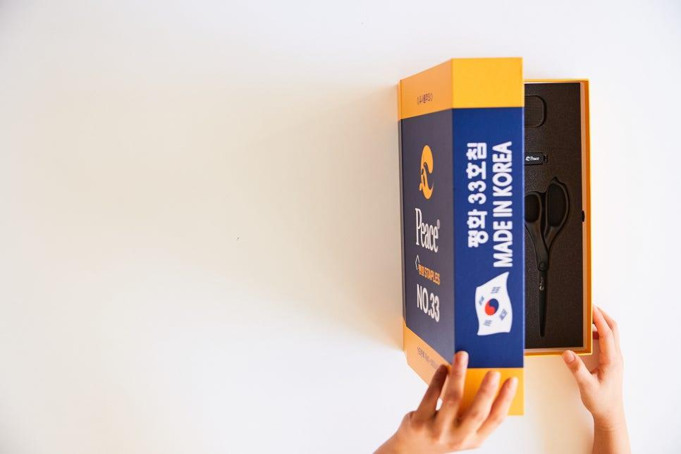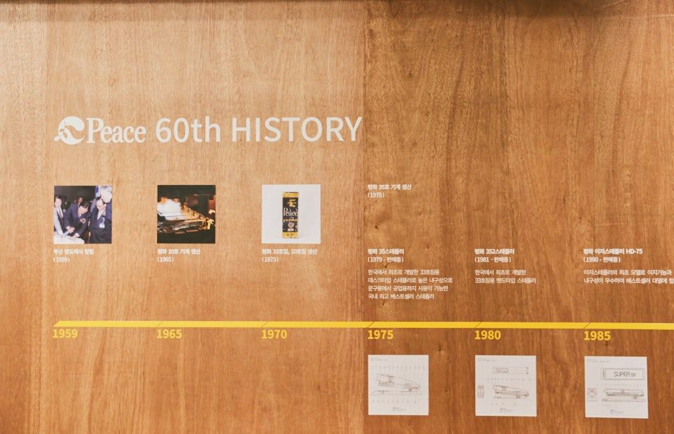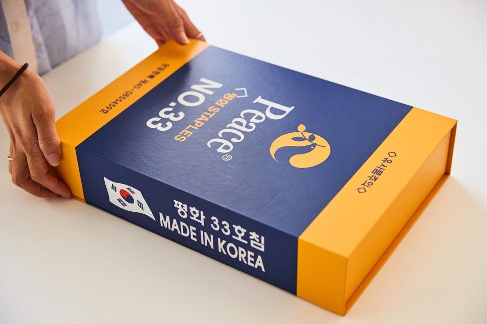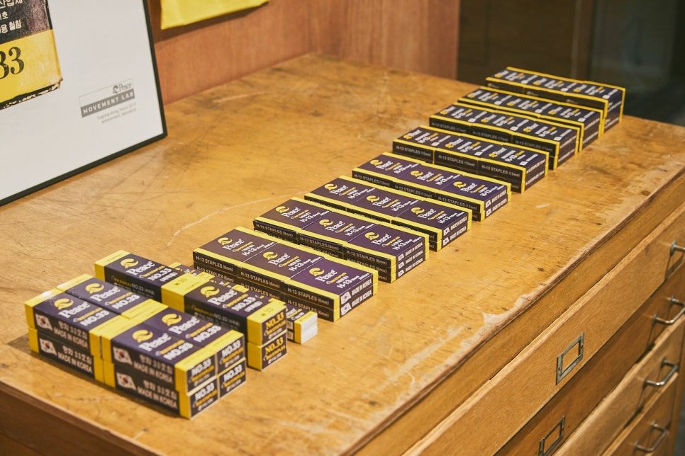 타임라인을 쭉 훑으면 전시를 이해하는 데 큰 도움이 된다. 1959년 부산 영도에서 창립된 피스코리아는 1973년 우리에게 익숙한 패키지 디자인을 가진 평화 33호침, 10호침 제작을 시작한다. 1979년에는 한국에서 최초로 33호침용 데스크 타입 스테이플러 ‘평화 35’를 생산한다. 현재까지 판매 중인 평화 35는 높은 내구성으로 문구용에서 공업용까지 사용이 가능한 국내 최고 베스트셀러 스테이플러로 자리 잡았으며, 사무실과 가정집의 책상 위에 반드시 있는 상징적인 존재가 됐다. 이 외에도 1980년 한국에서 최초 개발된 33호침용 핸드 타입 스테이플러 ‘평화 352’, 1990년부터 제작된 ‘평화 이지스테이플러 HD-75’ 등 다양한 모델이 베스트셀러이자 스테디셀러에 등극하며 현재까지 디자인의 큰 변화 없이 소비자를 만나고 있다.