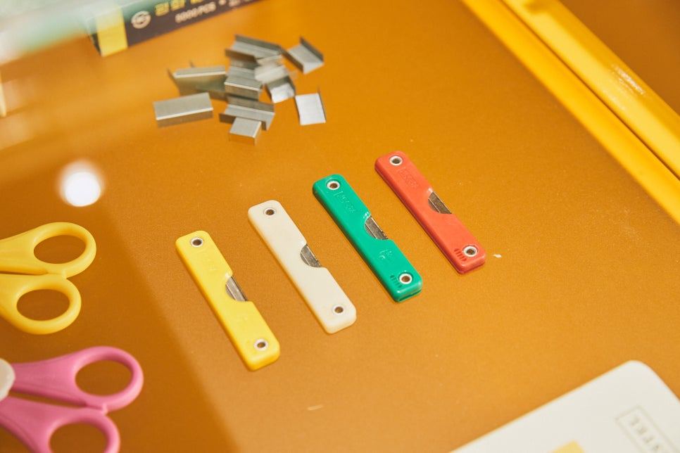 스테이플러가 주로 모노톤의 저채도 색으로 디자인되었다면, 대조적으로 다른 문구들의 색감은 상당히 다채롭다. 컬러 지협, 줄자, 컬러 스테플 10호침 등은 단조로웠던 오피스 풍경에 활력을 불어 넣기에 충분하다.