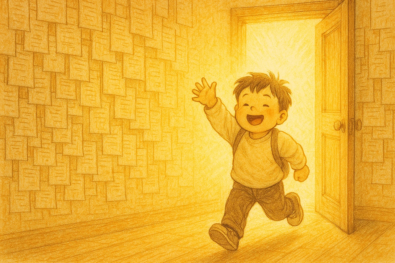 그 순간, 문이 활짝 열리며 아이가 뛰어들었다.