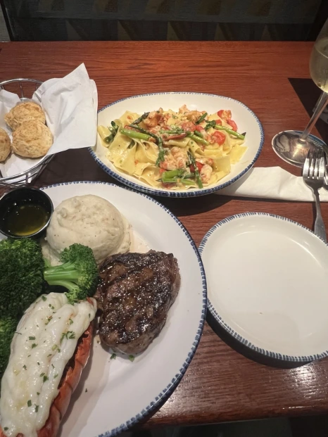 새우와 아스파라거스가 들어간 알리오 올리오 파스타, 랍스터와 스테이크 세트, 그리고 쇼비뇽 블랑 포도 품종으로 만든 화이트와인을 시켰다.