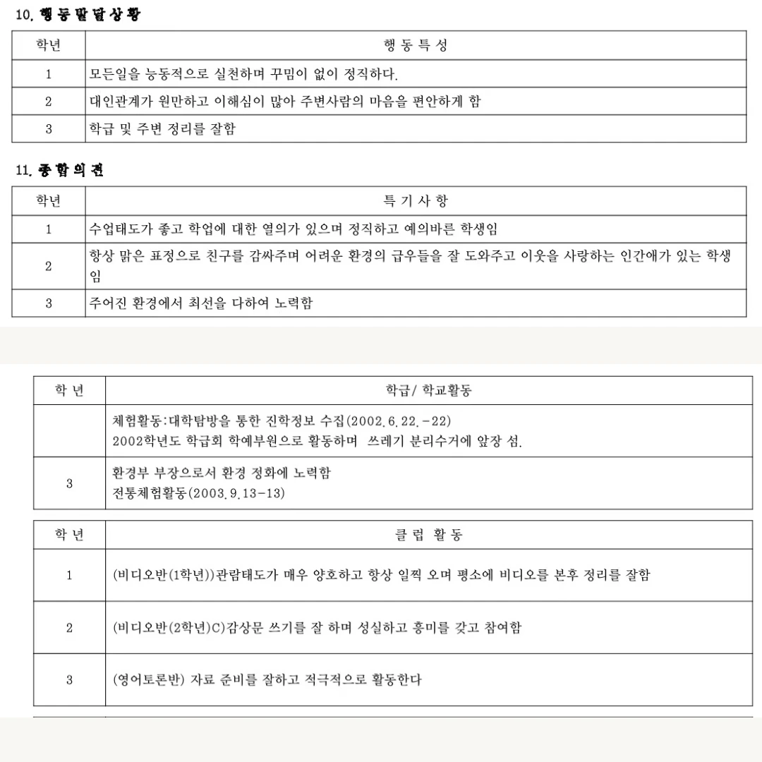 학생생활기록부를 정부24에서 열람해 볼 수 있다고 해서 궁금한 마음에 들어가 봤습니다(궁금한 거 못 참는 성격). 저의 기억과 기록된 내용 사이에 간극이 너무 커서 손발이 오그라들었습니다. 특히 고2 때 담임선생님은 저를 정말 싫어하시는 줄 알았는데 '인간애'라는 단어까지 사용하신 걸 보면, 츤데레셨던 거 같습니다. 저에 대한 기록이지만, 전혀 기억이 나지 않는 것들도 있었습니다. "내가 영어토론반에서 활동했었다고?", "나한테 이런 자격증이 있었다고?"(겨울 코트 주머니에서 오만 원 발견한 기분) "우리 부모님이 내가 공무원 되길 바라셨었다고?" "내가 교련을 배웠다고?" 고등학교 담임선생님 성함도 잘못 기억하고 있었고, '기록'을 보니 떠오르는 것들도 있었습니다.
