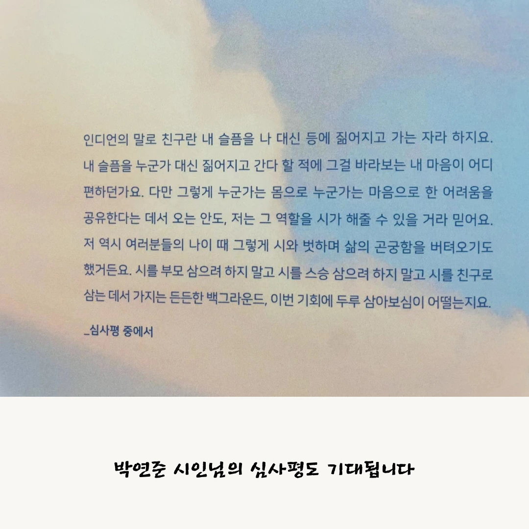 처음 시작하는 대회에는 공가희 대표님과 최원석 작가님이 힘을 주셨고, 작년에는 어려운 상황 속에서도 김민정 대표님이 심사를 맡아주셨습니다. 올해는 '소란'의 주인, 박연준 시인님이 심사를 하실 예정입니다. 청소년 북클럽 '소란'은 박연준 시인님의 동명 산문집에서 가져온 이름입니다. 소란한 시절을 소란 친구들에게 힘을 얻으며 건넜습니다.