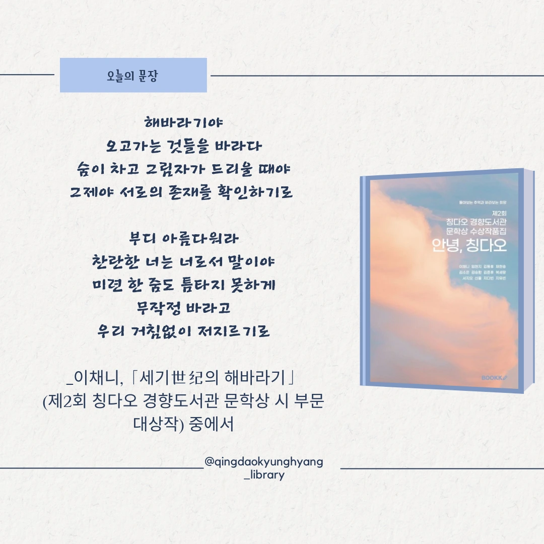 오늘의 문장은 2022년 돌아보는 추억과 바라보는 희망을 담은 이채니, 임현지, 김동후, 채현송, 김소은, 김승환, 김준후, 복세랑, 서지오, 신율, 지다빈, 지유빈의 『제2회 칭다오 경향도서관 문학상 수상작품집 안녕, 칭다오』(부크크, 2022)에서 가져왔습니다.
