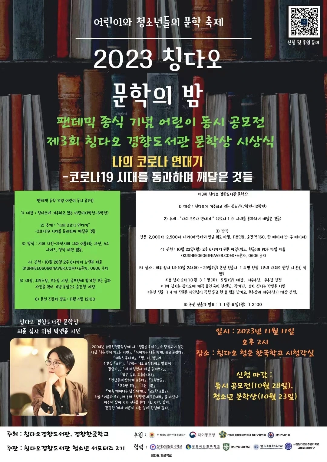 칭다오 경향도서관 문학상은 문학적 자질이 있는 이방인 청소년들을 발굴하고, 무엇이든 쓰는 것으로 소란한 시절을 잘 넘어가길 바라는 마음으로 시작하게 되었습니다. 팬데믹에 시작한 문학의 밤은 청소년들과 교민들에게 많은 위로가 되었고, 가능성을 보여줬습니다.