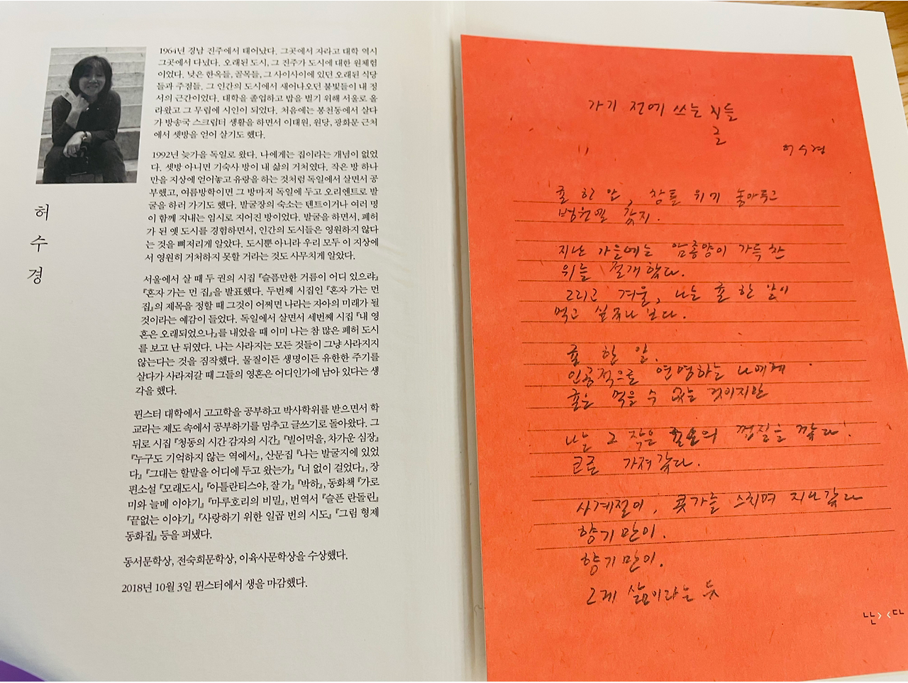 고 허수경 시인의 5주기입니다. 살아생전엔 잘 모르는 시인이었고, 돌아가시고 난 뒤에 나온 유고산문집을 통해 알게 된 시인이니 시인의 기일을 기억할 필요는 없겠으나, 기일이 개천절이라 굳이 기억하지 않아도 기념하게 됩니다. 저에겐 너무 강렬했던 시인의 첫 유고산문집은 이제 제법 세월의 흔적이 느껴집니다. 많이 읽히길 바랐고, 기대했던 것보단 많이 읽힌 이 유고산문집은 고 황현산 선생님의 트윗 모음집과 더불어 간식처럼 꺼내 읽는 책입니다.