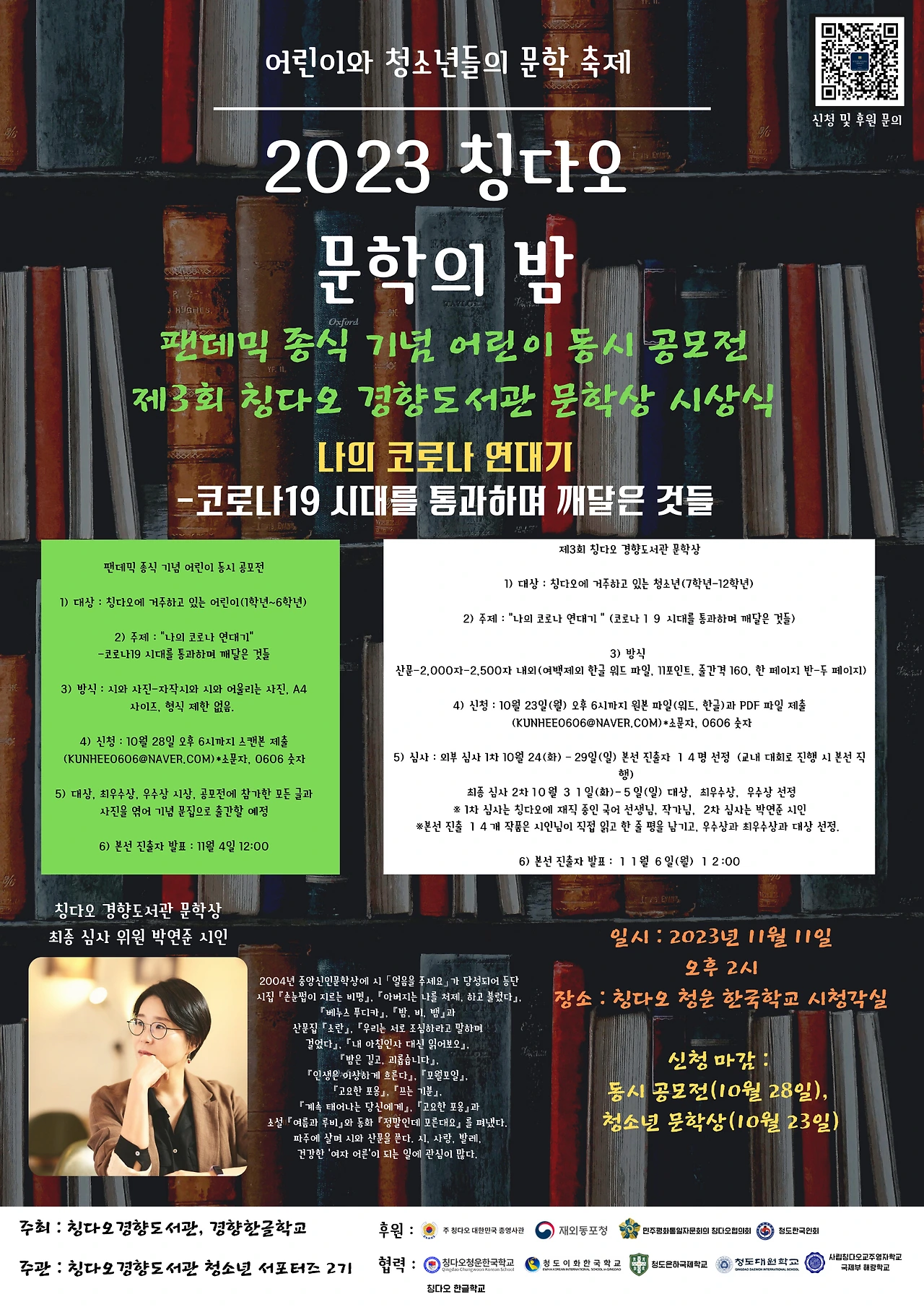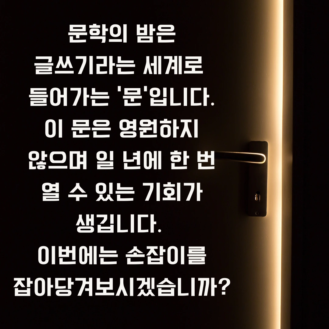 지독한 시절을 견딘 나를 위로할 자격이 적어도 우리에겐 충분히 있는 거 같습니다. 이번 문학의 밤은 오로지 자신을 위해 참가해 보세요. 글쓰기가 자신을 돌보는 도구가 될 수 있다는 사실을 한 명이라도 깨닫는다면 저는 이번 대회는 성공했다고 볼 겁니다.