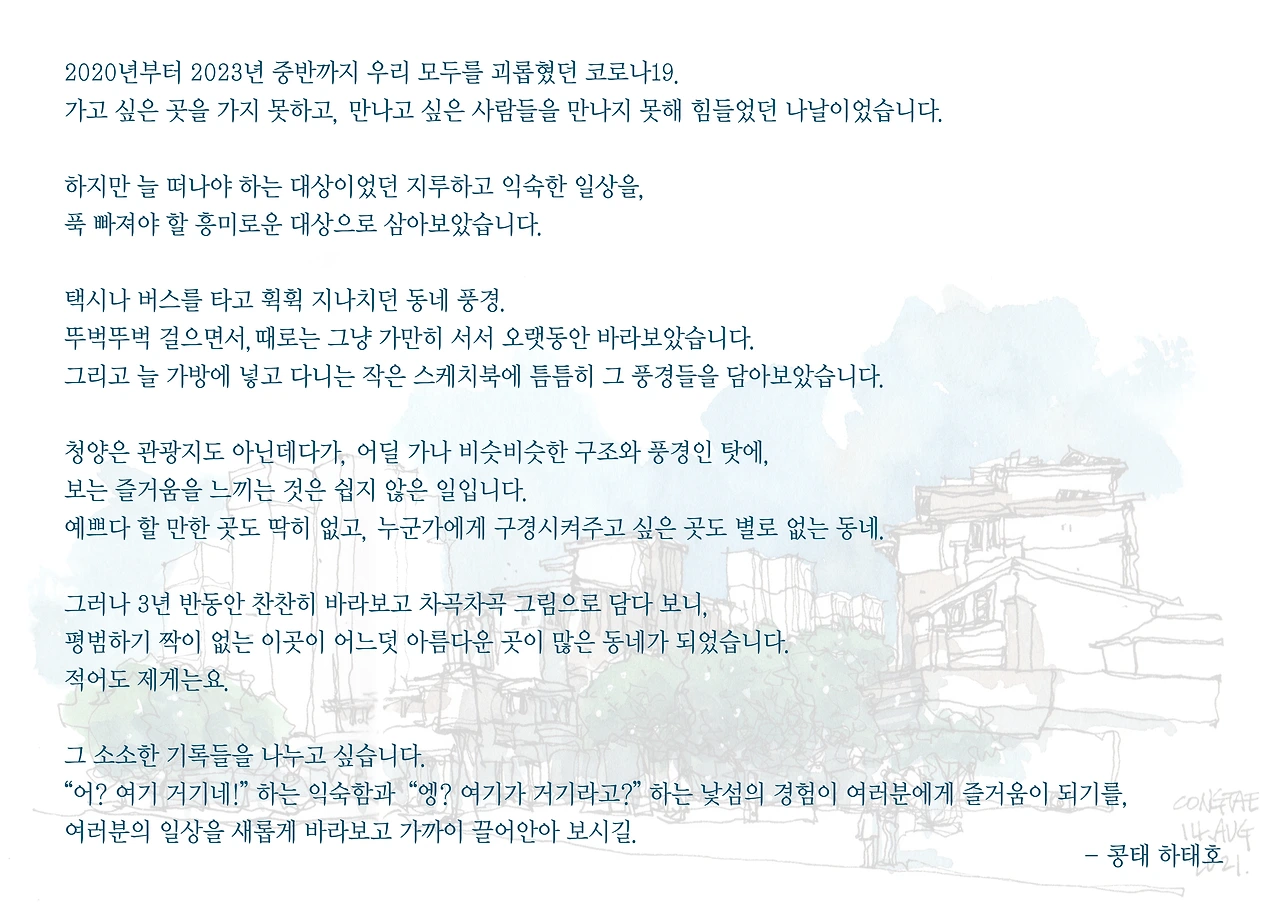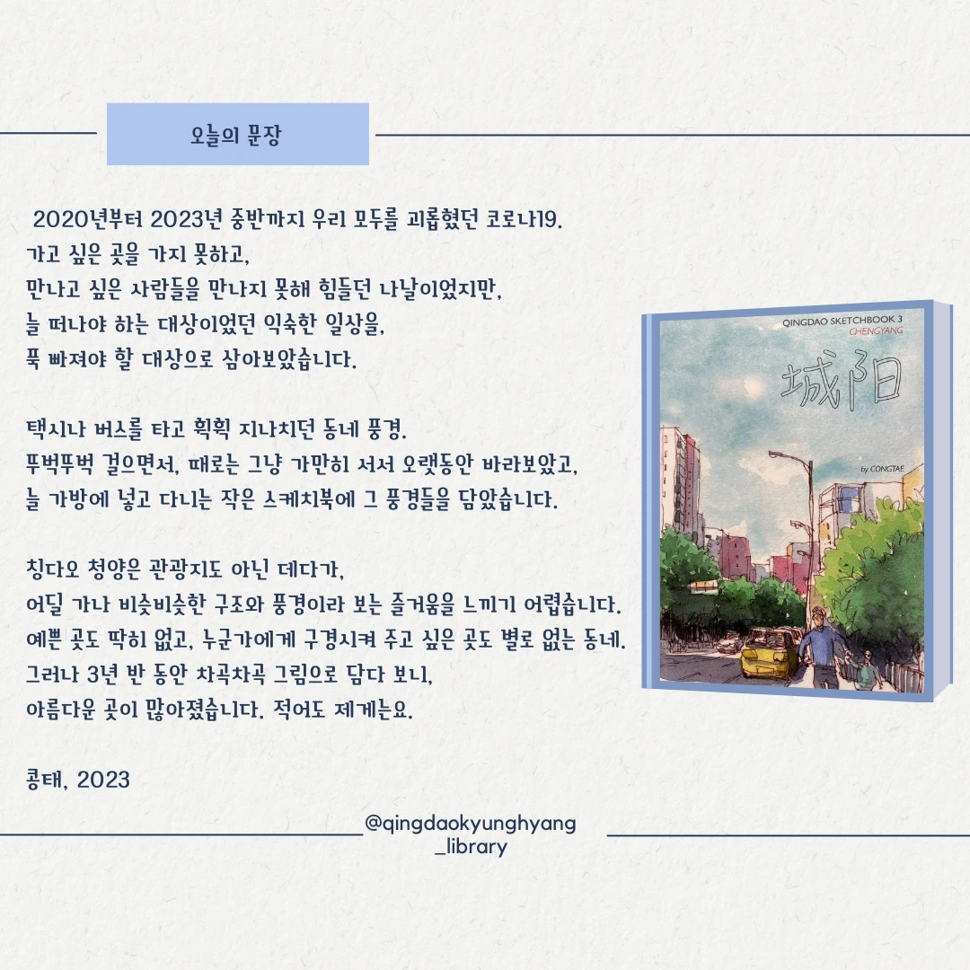 오늘의 문장은 칭다오 어반스케치의 대부 CONGTAE 작가님의 세 번째 스케치북, 『QINGDAO SKETCHBOOK 3 : CHENGYANG 城阳』(2023)에서 가져왔습니다.