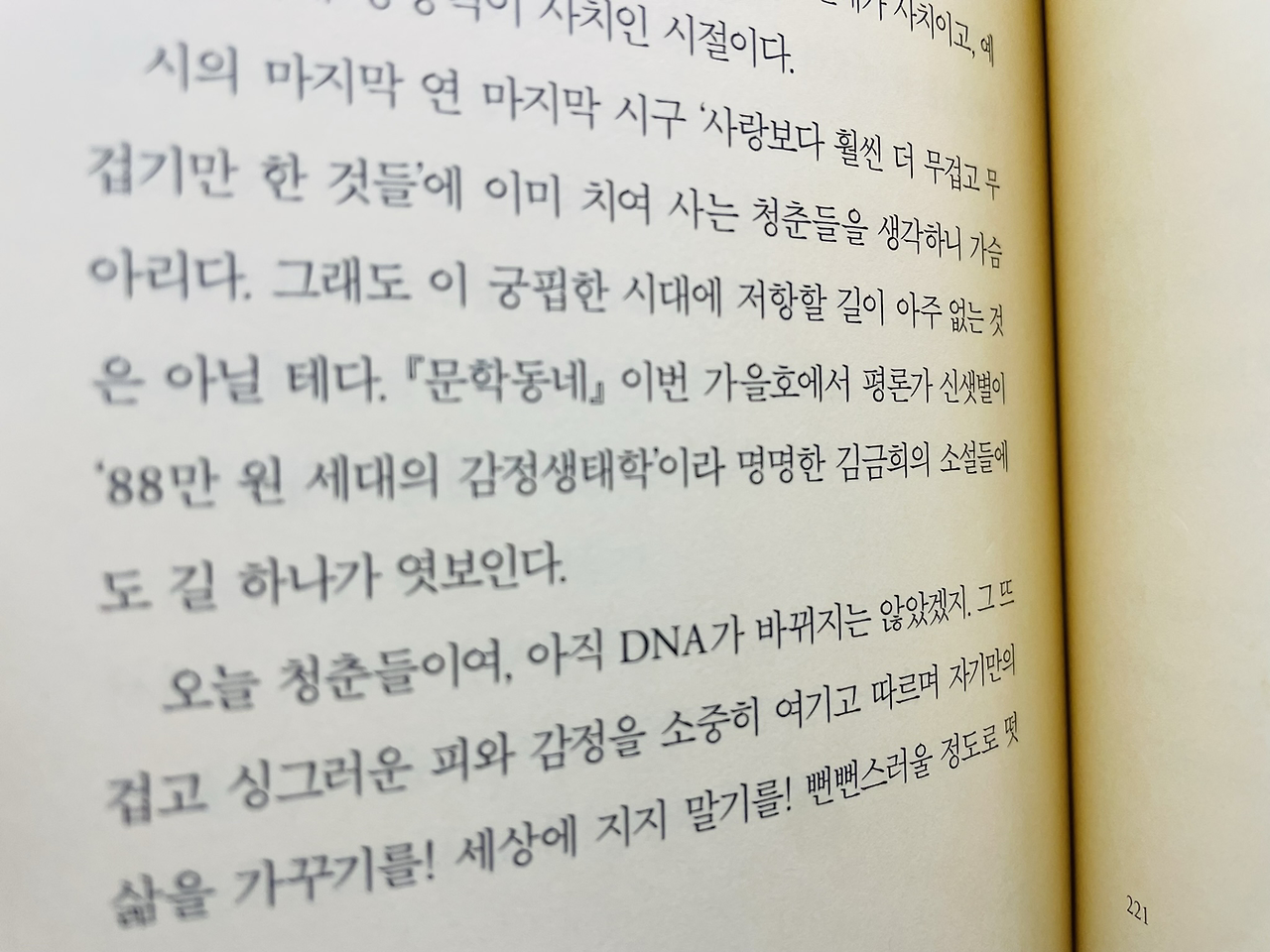 오늘 청춘들이여, 아직 DNA가 바뀌지는 않았겠지. 그 뜨겁고 싱그러운 피와 감정을 소중히 여기고 따르며 자기만의 삶을 가꾸기를! 세상에 지지 말기를! 뻔뻔스러울 정도로 떳떳하기를! 어떤 책은 세상을 이기는 힘을 키워준다.