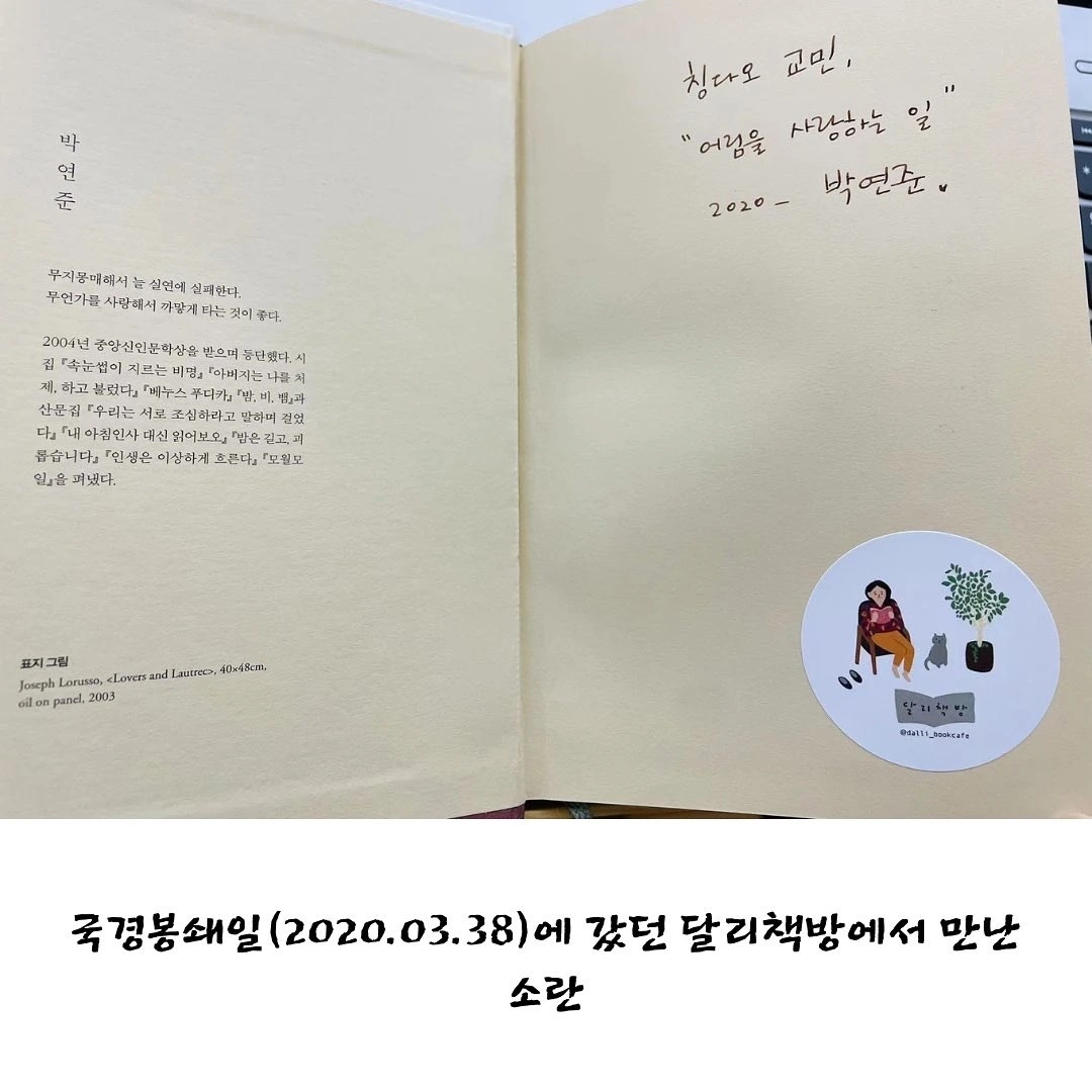 박연준 시인님의 <소란> 역시 사연이 깃든 책입니다. 이 책은 2020년 3월 28일, 제주도 달리책방에서 구매한 것입니다. 팬데믹으로 국경봉쇄를 시작한 날이죠. 격리 정책이 시행되기 하루 전에 제주에 도착해서 격리 없이 조용히 책방만 다니고 있었는데, 가는 책방마다 칭다오에서 왔음을 밝히고 가도 되는지 허락을 받곤 했습니다. 이전하기 전 소리소문 대표님은 허락해 주셨고, 달리책방은 연락이 안 되어 책방 앞에서 여쭤봤다가 너무 놀라게 해 드린 기억이 납니다. 지독하게 소란한 시절 '소란'을 만났고, 초판 서문에 있는 말을 보고 희망을 품었습니다.