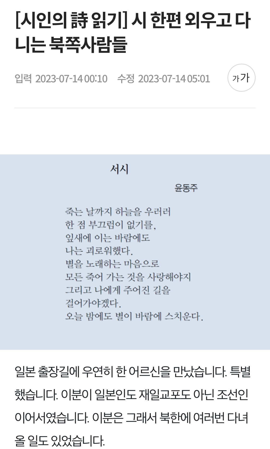 더 특별한 것은 시인이라고 나를 소개했더니 북한에서 코로나19 시절 직전에 청년들과 술자리를 가진 적이 여러번 있었는데 노래를 즐겨 부르지 못하는 사람들은 시를 한편씩 낭송한다고 했습니다. 술자리에서 시를 낭송한다고요? 나는 눈이 휘둥그레졌습니다. 그럴 때 가장 많이 등장하는 시가 윤동주 시인의 시라고 했습니다.
