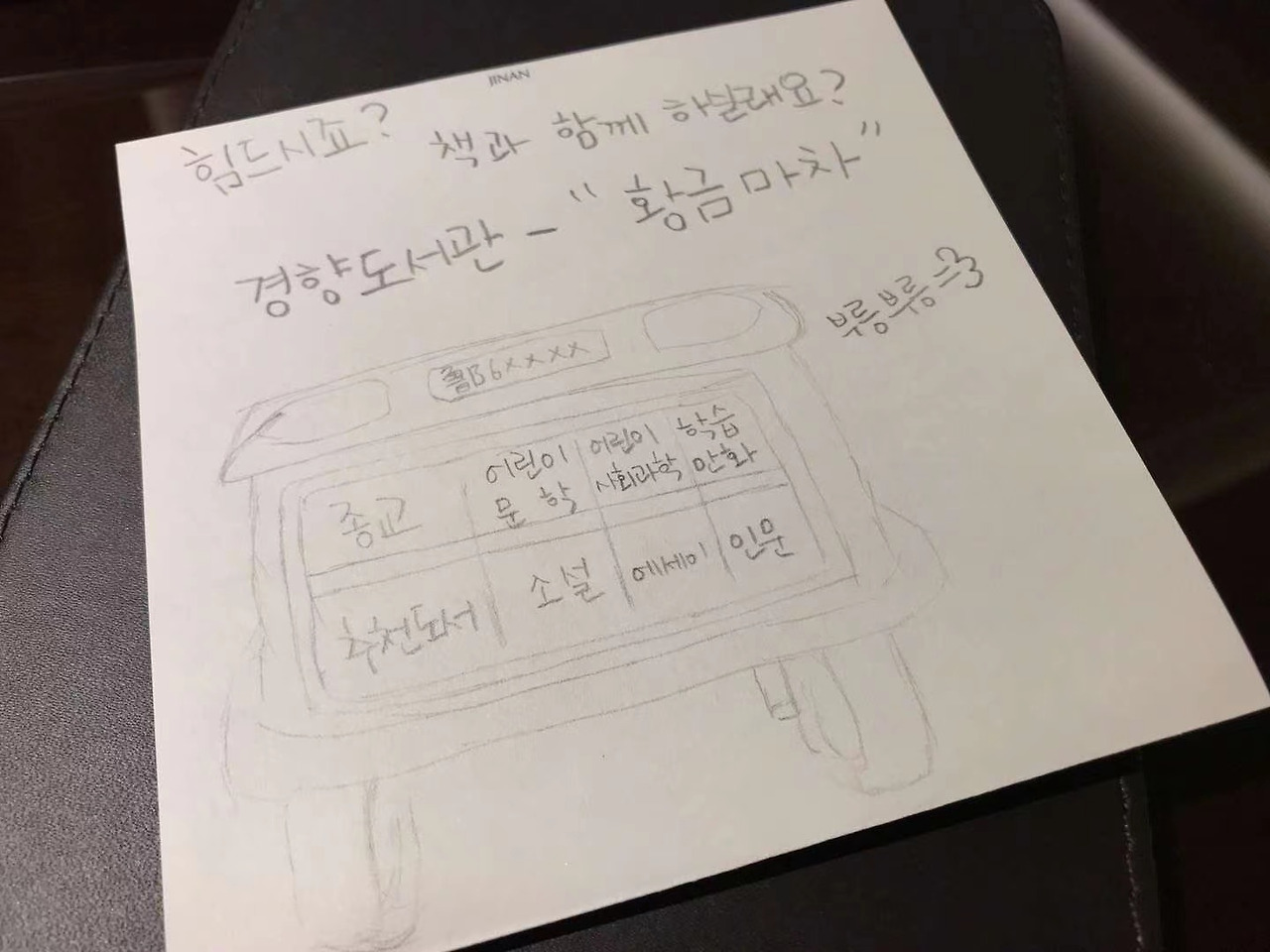 지난으로 향하는 도중에 봤던 풍경이 계속 생각났다. 지난으로 향하면서 코로나가 무엇인지 점점 실감하게 되었다. 휴게소에서의 풍경, 두려움에 가득 찬 눈빛, 영화 <감기> 같은 곳에서 봤던 풍경이 지난 톨게이트에서 펼쳐졌다. 방호복을 입은 사람들이 차를 막고 검문하는 모습을 보며 확신했다. 사스랑은 다른 거구나. 문득 지난 톨게이트에 멈춰 선 차와 뒤에 가득 실린 책들을 보며 '황금마차'가 생각났다. 군대에서 죽어라 훈련받고 있으면 어디든지 달려오던 이동식 매점, 호텔에 도착해서 아내와 상의 후 그림을 그린 뒤 "나 이거 해야겠다."라고 말하자, 아내는 내가 막 그린 그림을 잘 정리해서 그려줬다. 1월 27일 자정을 넘긴 시간, 지난 샹그릴라 호텔에서 황금마차가 탄생했다.