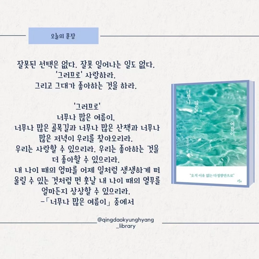 오늘의 문장은 아름다운 문장으로 이야기를 이끌어가는 김연수 작가의 『너무나 많은 여름이』(레제, 2023)에서 가져왔습니다.