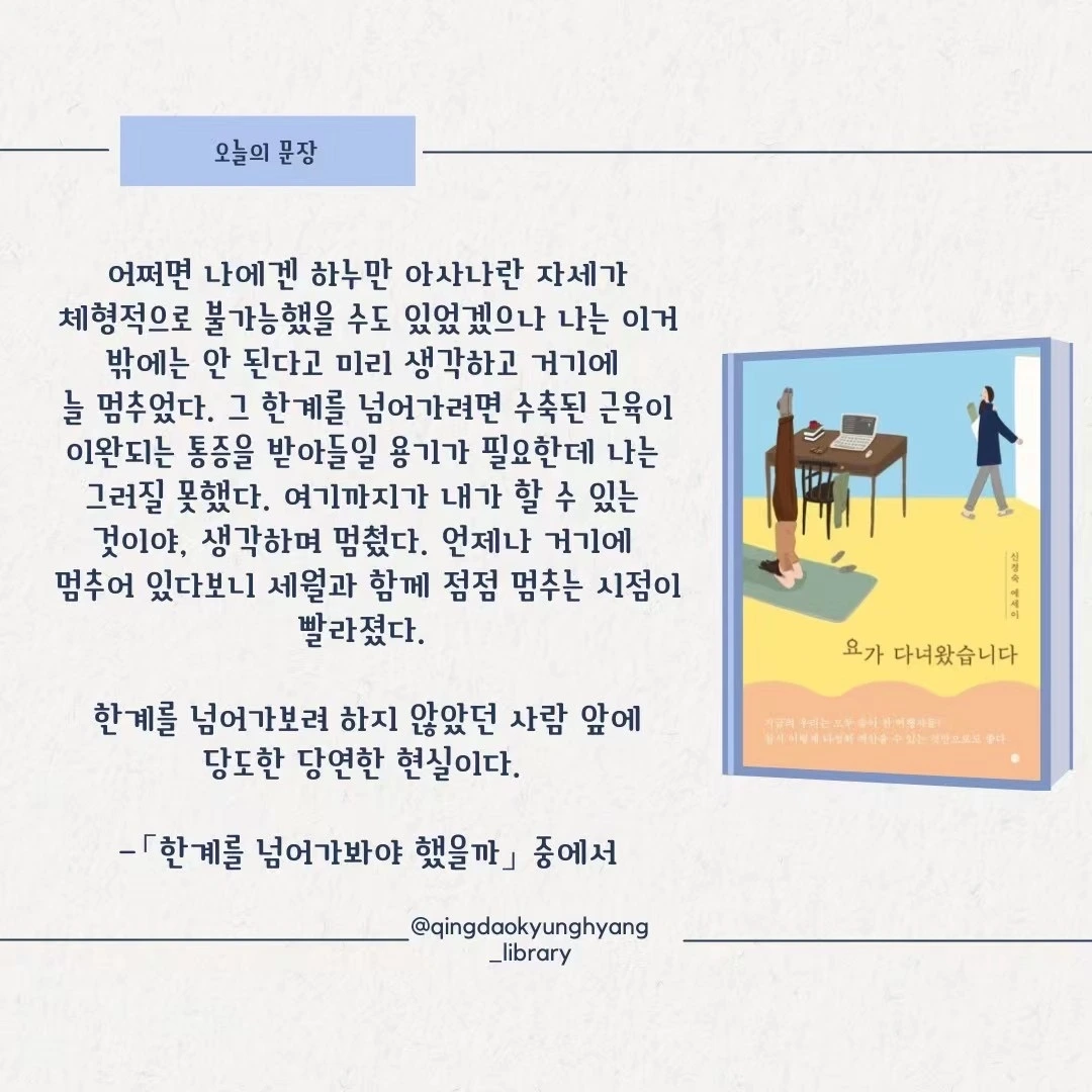#신경숙작가 #요가다녀왔습니다 #오늘의문장 #달출판사 #요가 #산문집 #칭다오 #칭다오청양 #칭다오경향도서관