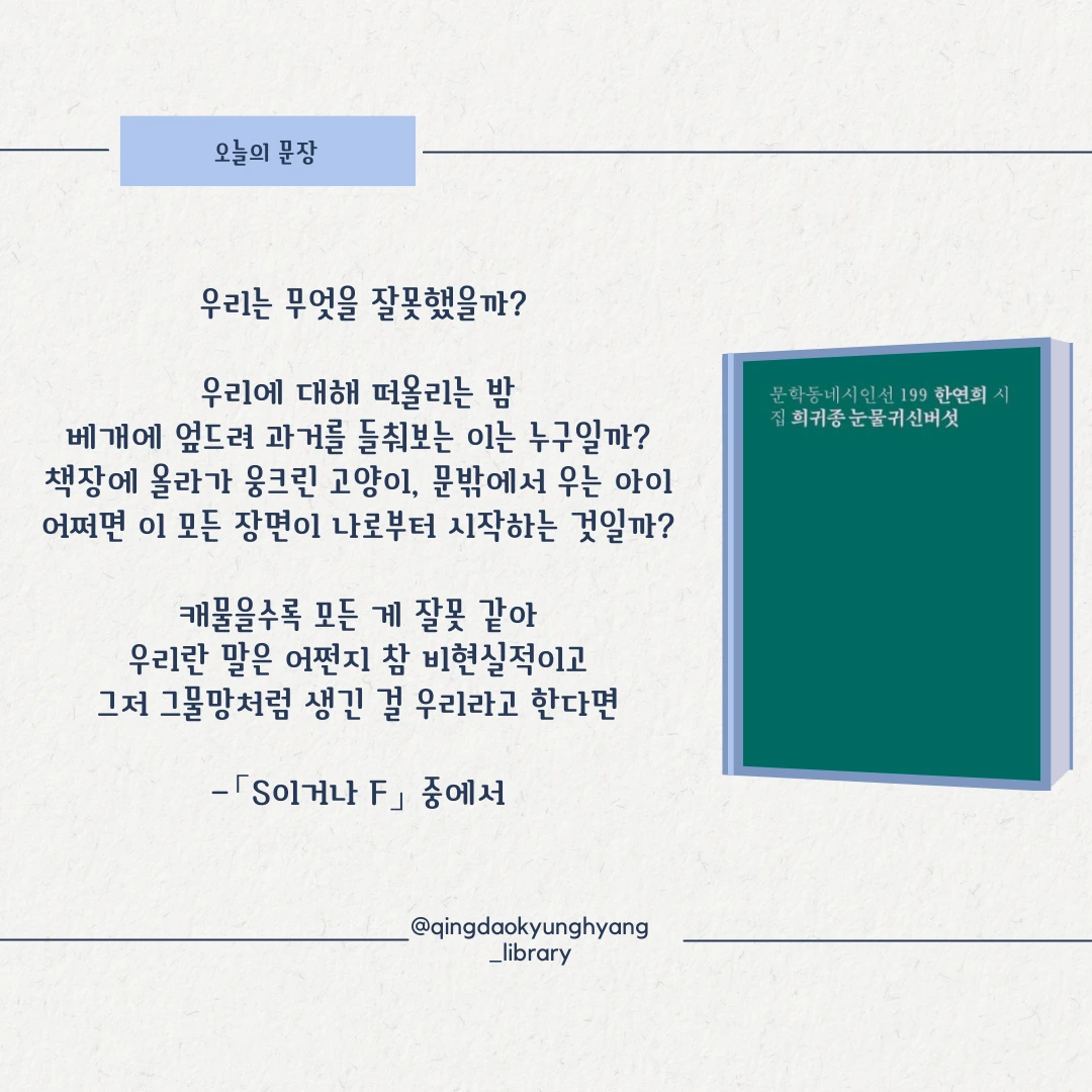 #한연희시인 #희귀종눈물귀신버섯 #오늘의문장 #문학동네시인선 #문학동네 #시집 #칭다오 #칭다오청양 #칭다오경향도서관